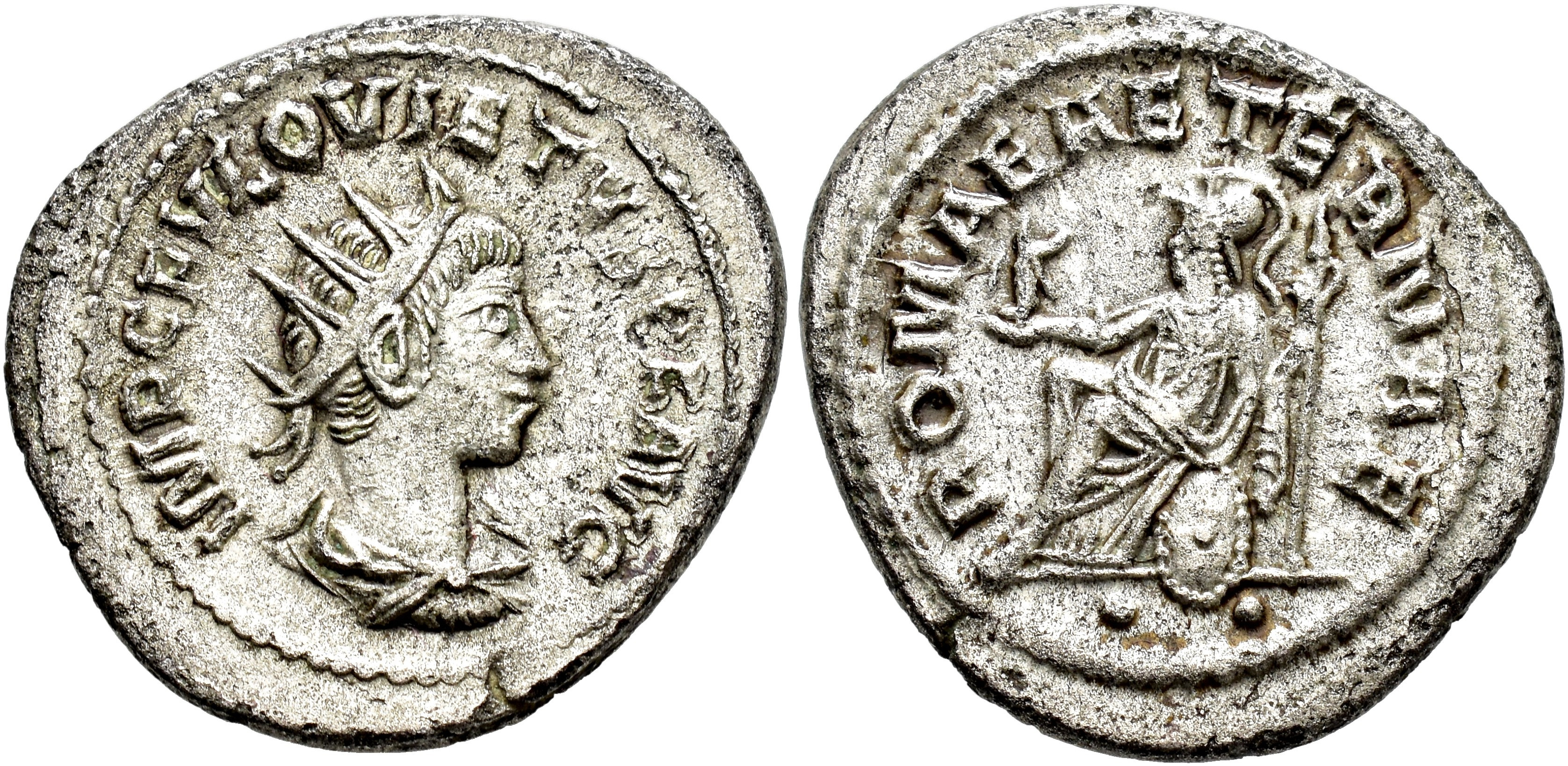 IMPERIO ROMANO. QUIETO (260-261). Antoniniano. Antioquía (260-261). A/ Busto radiado, drapeado y acorazado a der.; IMP C FVL QVIETVS P F AVG. R/ Roma sentada a izq. con Victoria y lanza; ROMAE AETERNAE. VE 4,8 g. 21,9 mm. RIC-9. MBC+. Escasa.