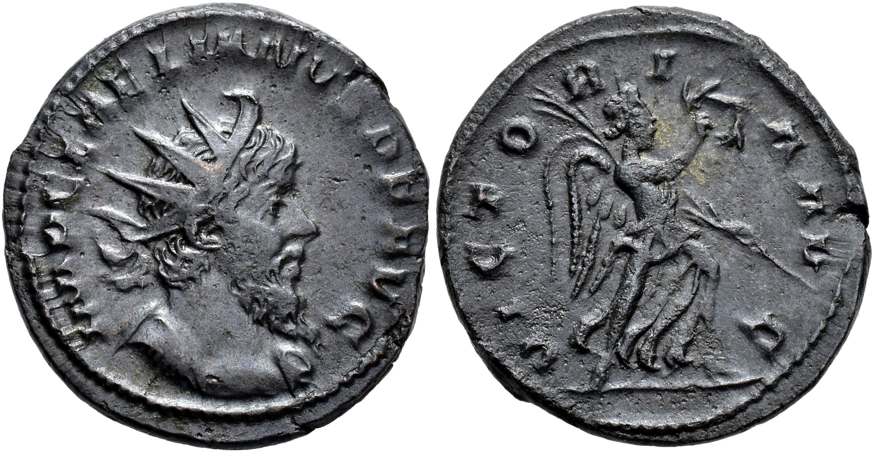 IMPERIO ROMANO. LAELIANO (268-269). Antoniniano. Moguntiacum (269). A/ Busto radiado y con coraza a der.; IMP. C. LAELIANVS P. F. AVG. R/ Victoria con palma y corona avanzando a der.; VICTORIA AVG. VE 4,08 g. 21,5 mm. RIC-9. MBC/MBC+. Muy escasa.