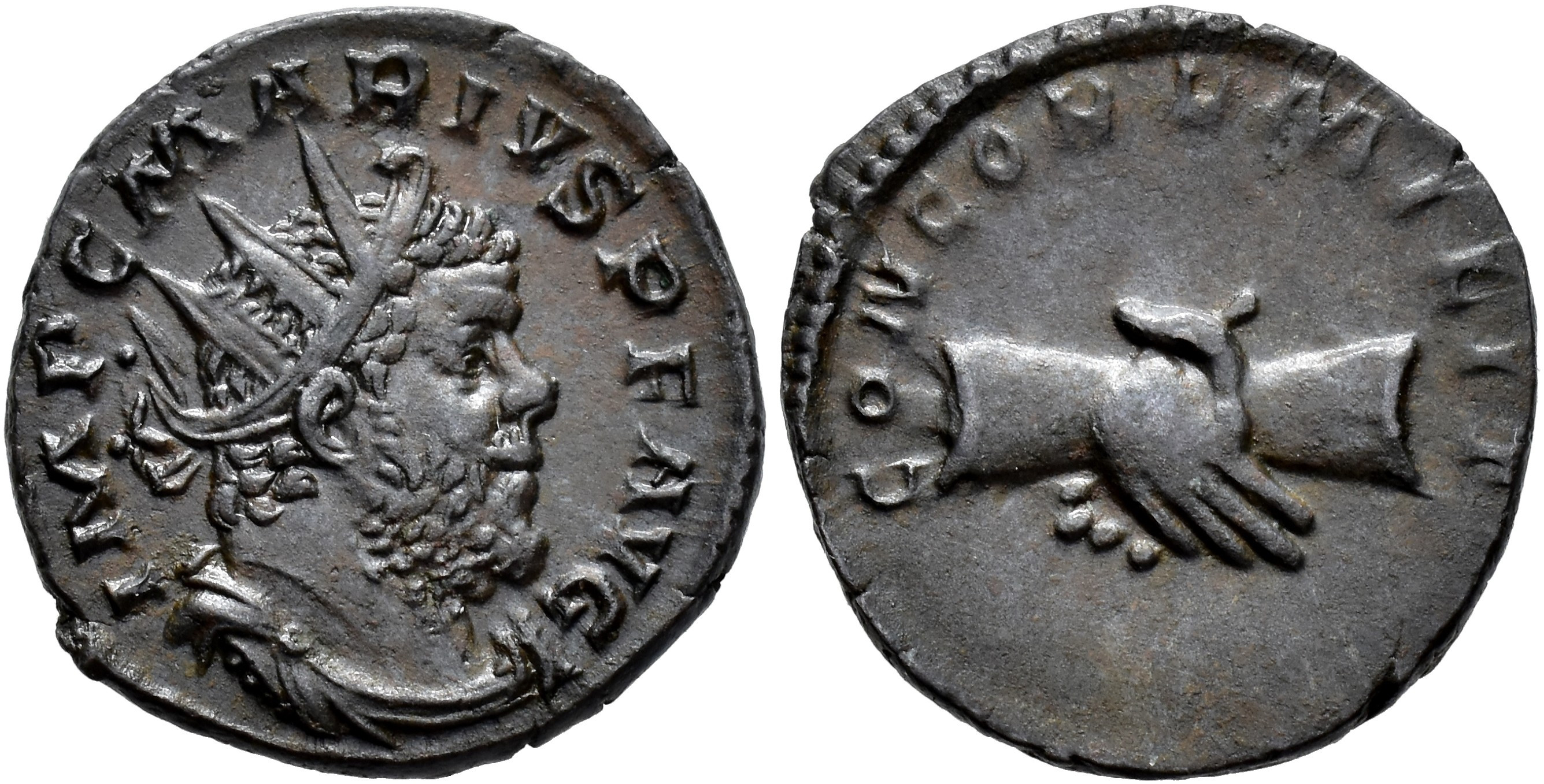IMPERIO ROMANO. MARIO (268-269). Antoniniano. Colonia (269). A/ Busto radiado a der. R/ Manos estrechadas; CONCORD MILIT. VE 2,58 g. 18,6 mm. RIC-6. Pátina oscura. EBC-/MBC+. Escasa.