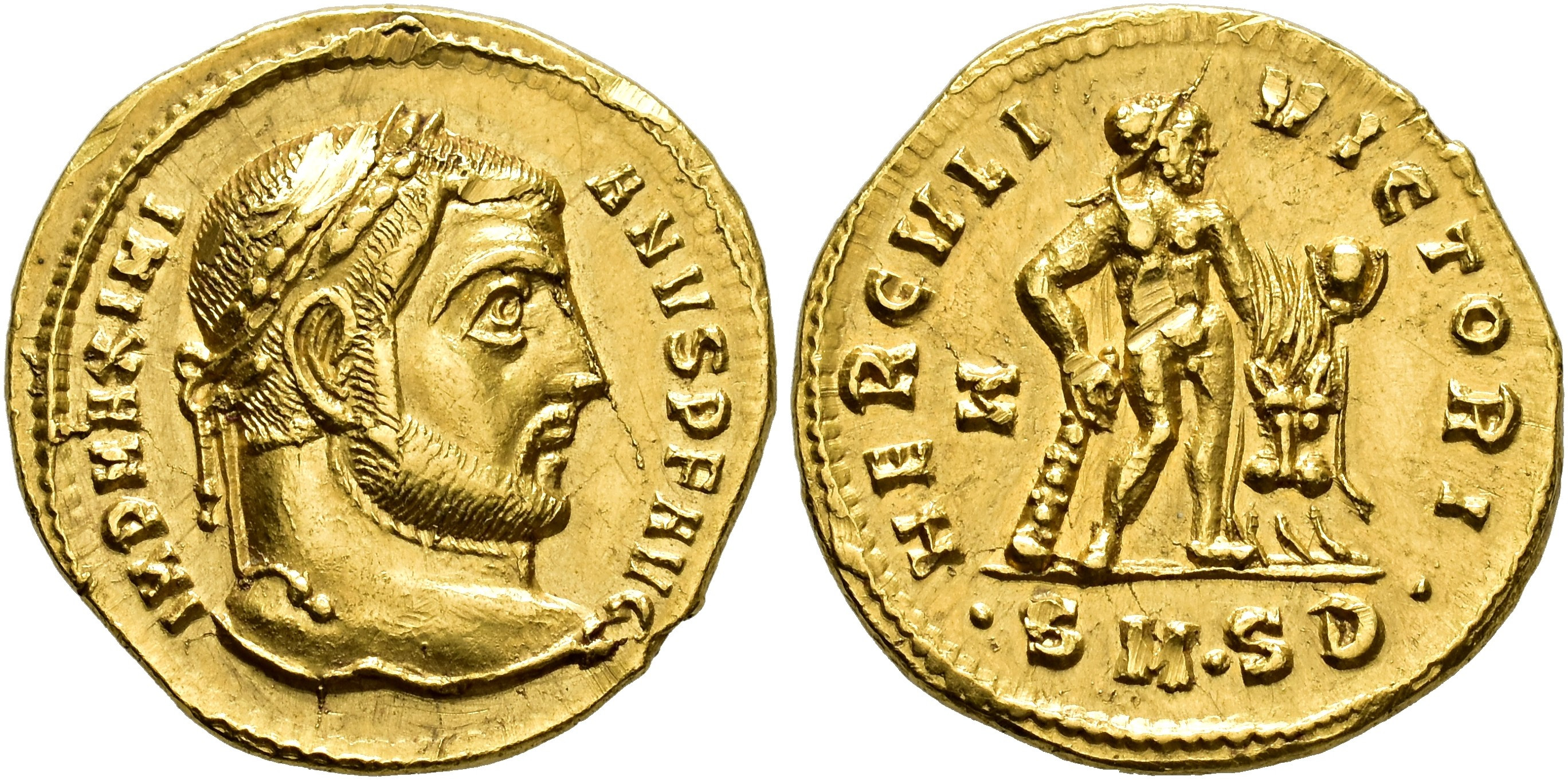IMPERIO ROMANO. GALERIO MAXIMIANO (305-311). Áureo. Serdica (305-306). A/ Cabeza laureada a deer.; IMP MAXIMIANVS P F AVG. R/ Hércules a der. con clava, leonté y manzana; HERCVLI VICTORI. Sigma invertida /-/.SMSD. AU 5,4 g. 18,7 mm. RIC-6b.; Cal.-4907, mismo ejemplar. Dos golpes y rebaba en anv. Golpe en rev. EBC. Rara.