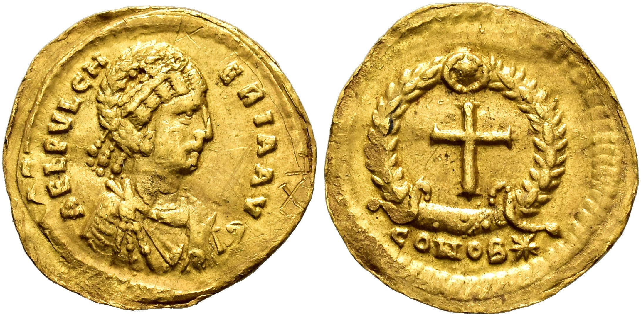IMPERIO ROMANO. ELIA PULQUERIA. Tremissis. Constantinopolis (416). A/ Busto diademado y drapeado a der. R/ Láurea rodeando cruz; -/-//CONOB*. AU 1,44 g. 14,7 mm. RIC-214. Ligeramente alabeada. Grafitos. MBC/MBC+. Escasa.