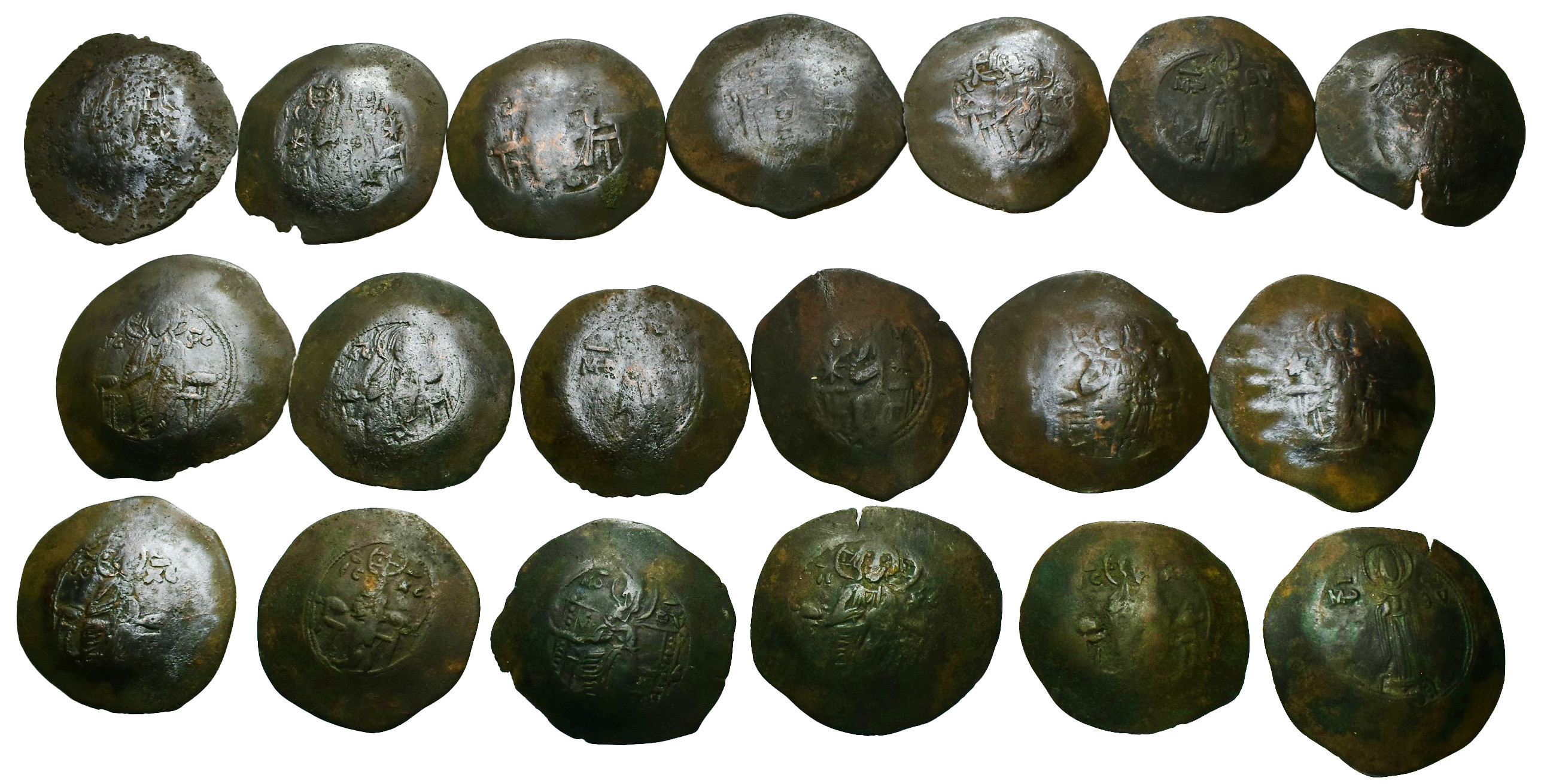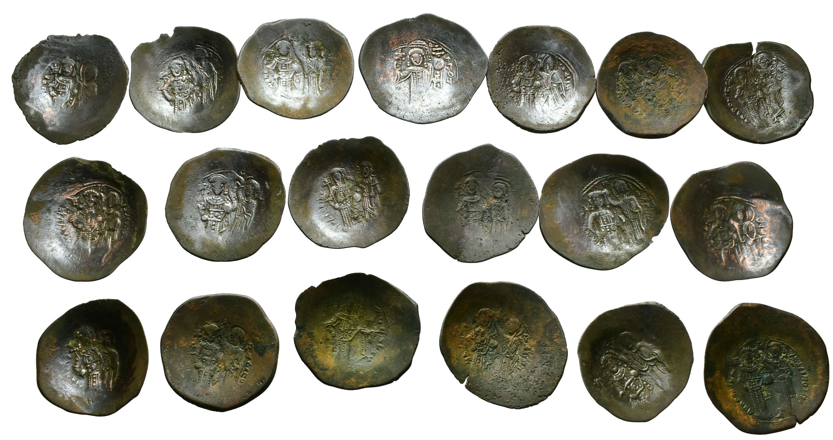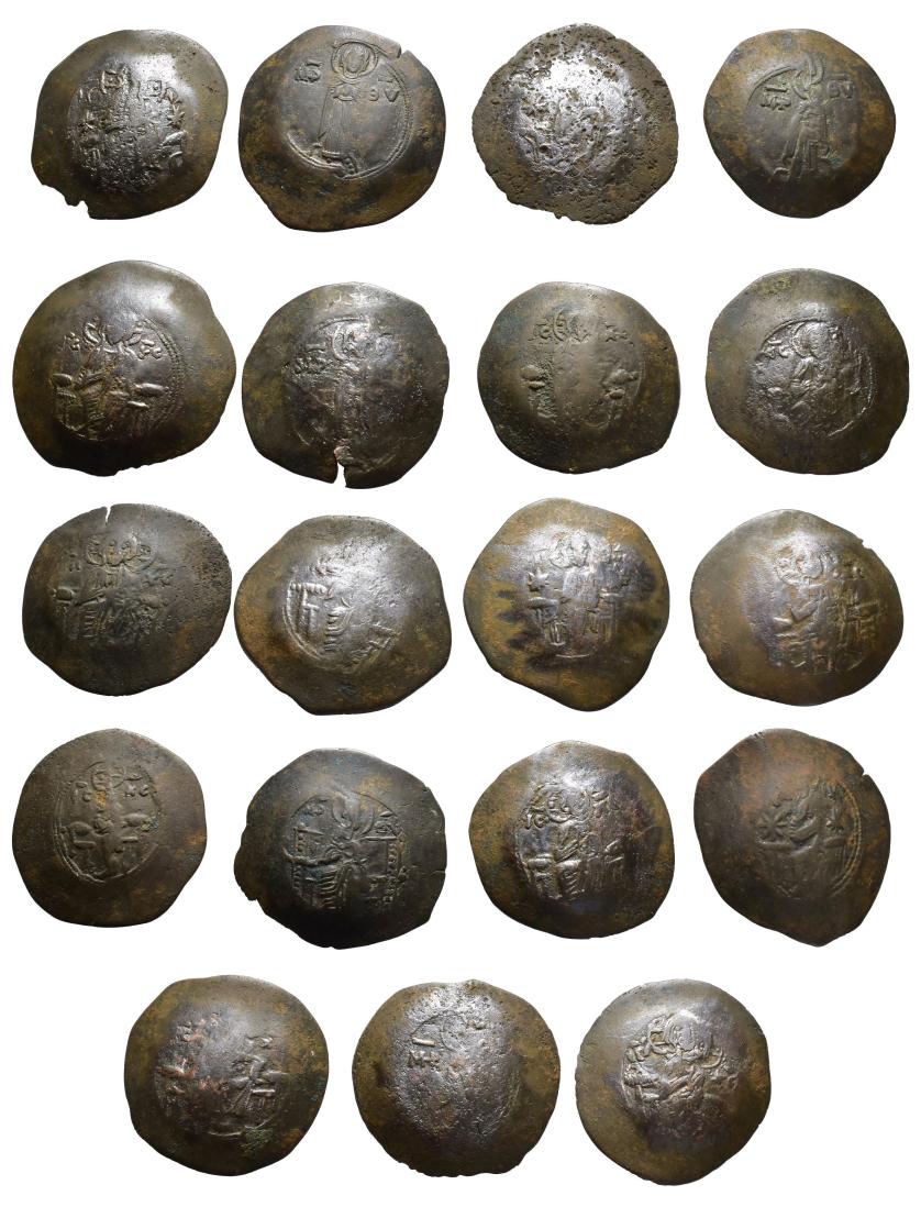IMPERIO BIZANTINO. Lote de 19 aspron: 3 de Andrónico y 16 de Manuel I. BC/MBC.