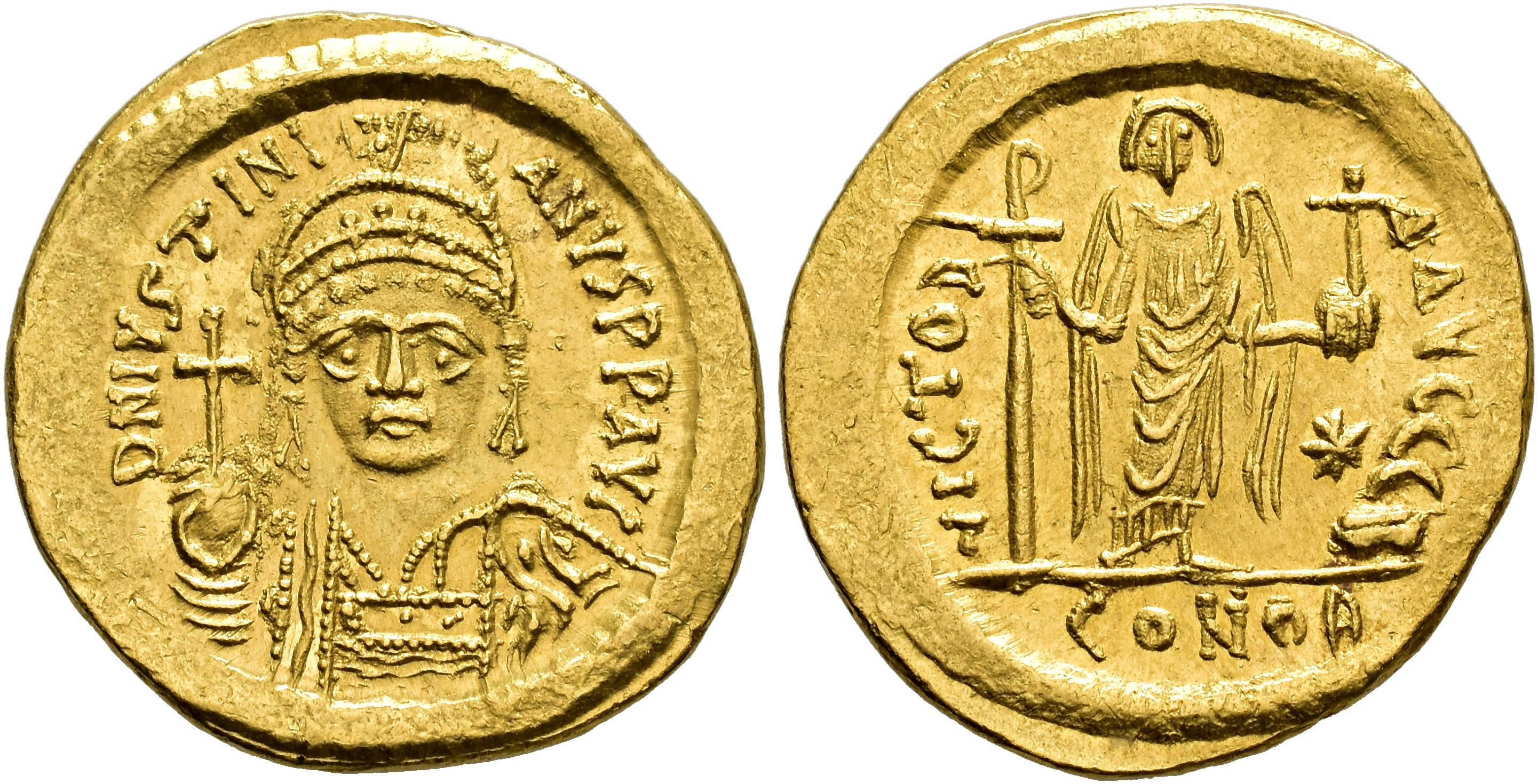 IMPERIO BIZANTINO. JUSTINIANO I (527-565). Sólido. Constantinopolis. A/ Busto frontal con globo crucífero. R/ Ángel de frente con globo crucífero y bastón rematado en crismón, a der. estrella. Oficina B. AU 4,47 g. 19,9 mm. SBB-140. B.O. EBC.