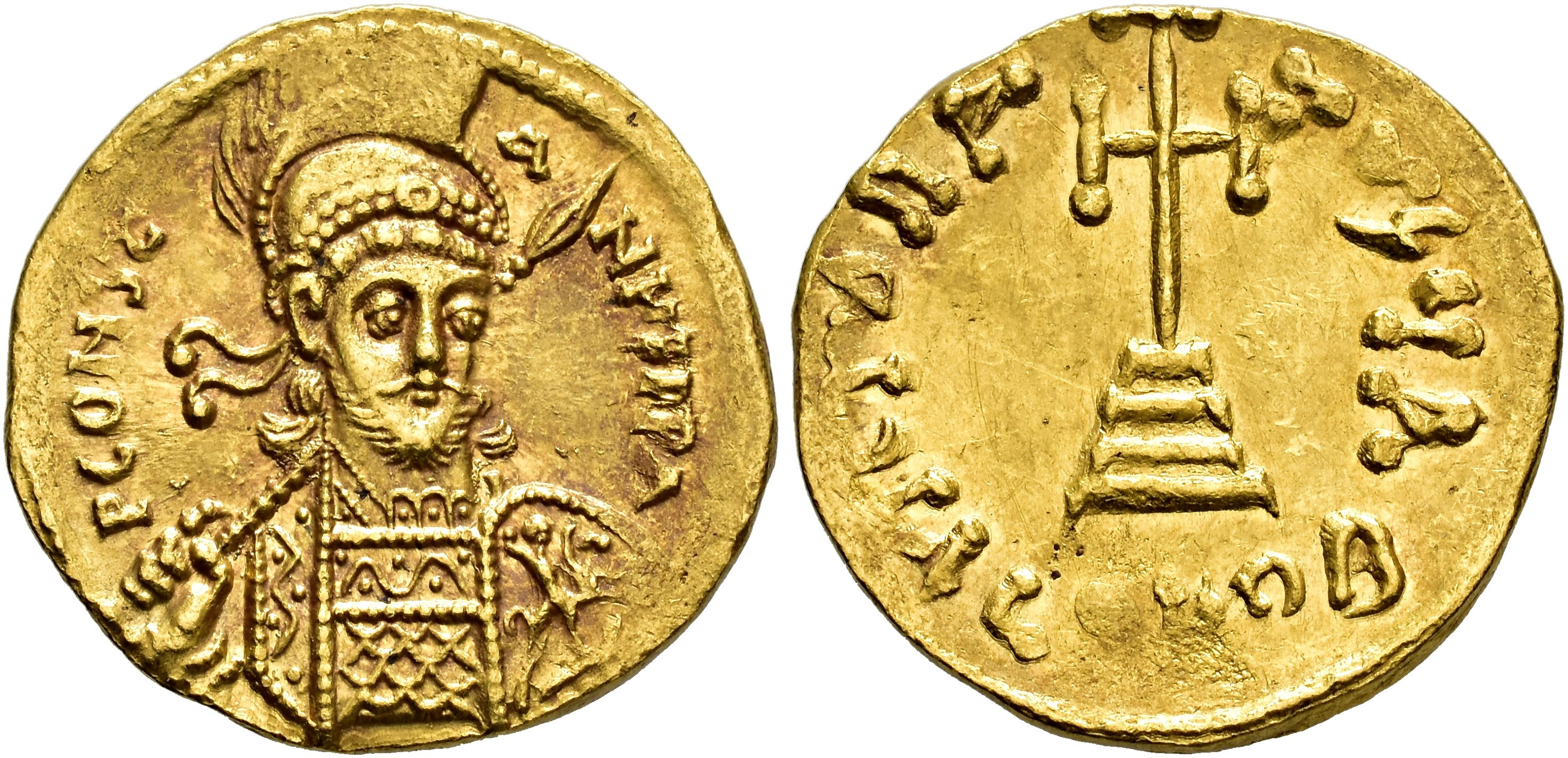 IMPERIO BIZANTINO. CONSTANTINO IV (668-685). Sólido. Constantinopolis. A/ Busto semifrontal con casco, coraza, escudo y lanza. R/ Cruz potenzada sobre gradas, oficina A. AU 4,48 g. 19,6 mm. SBB-1157. Pequeños vanos. R.B.O. EBC-.