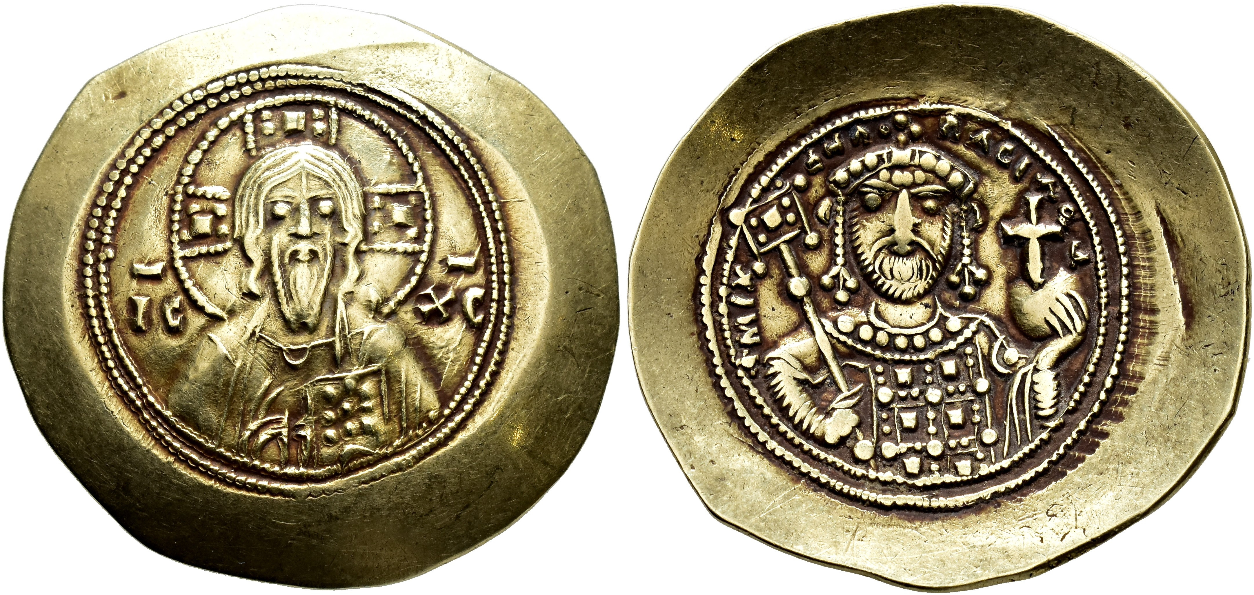 IMPERIO BIZANTINO. MIGUEL VII (1071-1078). Histamenon nomisma. Constantinopolis. A/ Busto de Cristo con Evangelio y en gesto de bendecir. R/ El emperador de medio cuerpo con labarum y globo crucífero. EL 4,44 g. 27,9 mm. SBB-1868. MBC+.