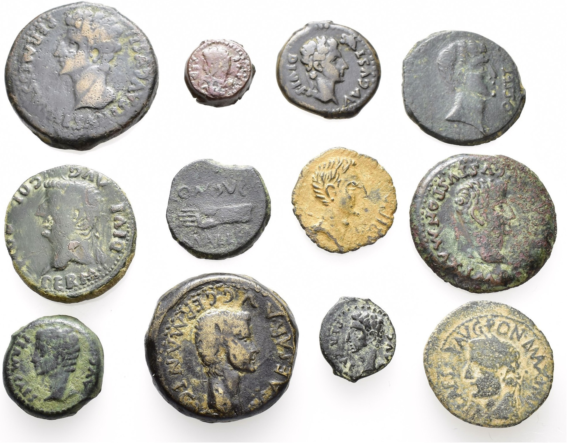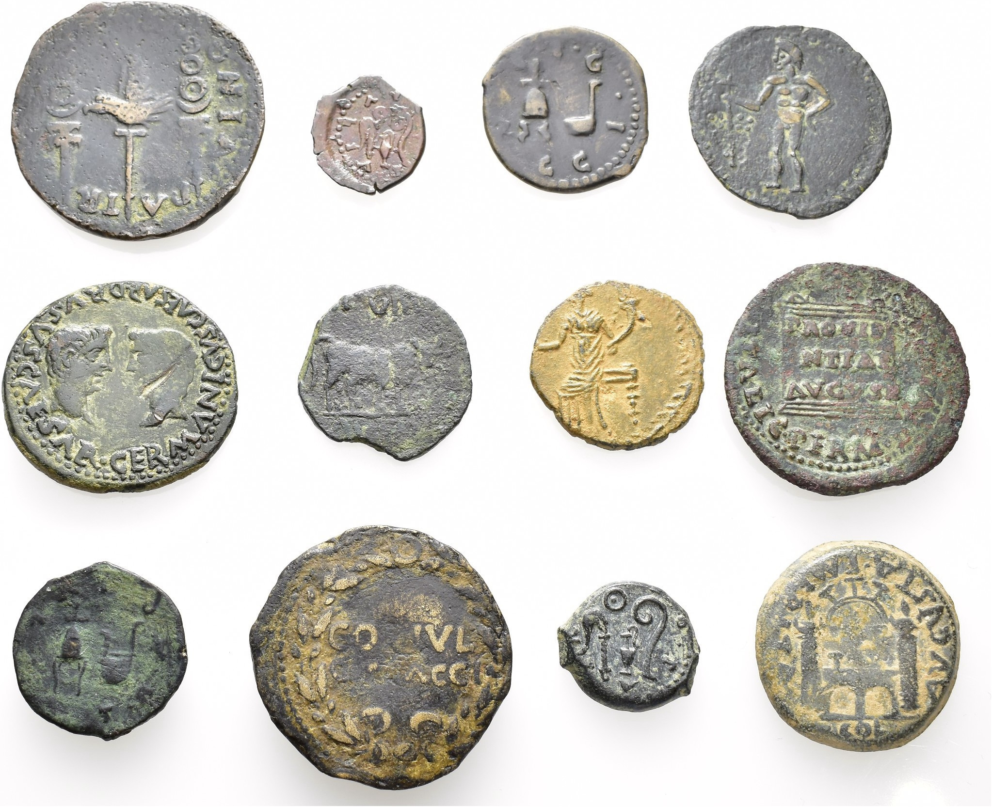 HISPANIA ANTIGUA. Lote de 12 piezas hispano-romanas: 1 dupondio, 5 ases, 4 semis, y 2 cuadrantes. Cecas: Acci (2), Colonia Patricia (2), Iulia Traducta (2), Irippo, Osset, Colonia Romula, Italica, Carthago Nova y Emerita. BC/MBC.