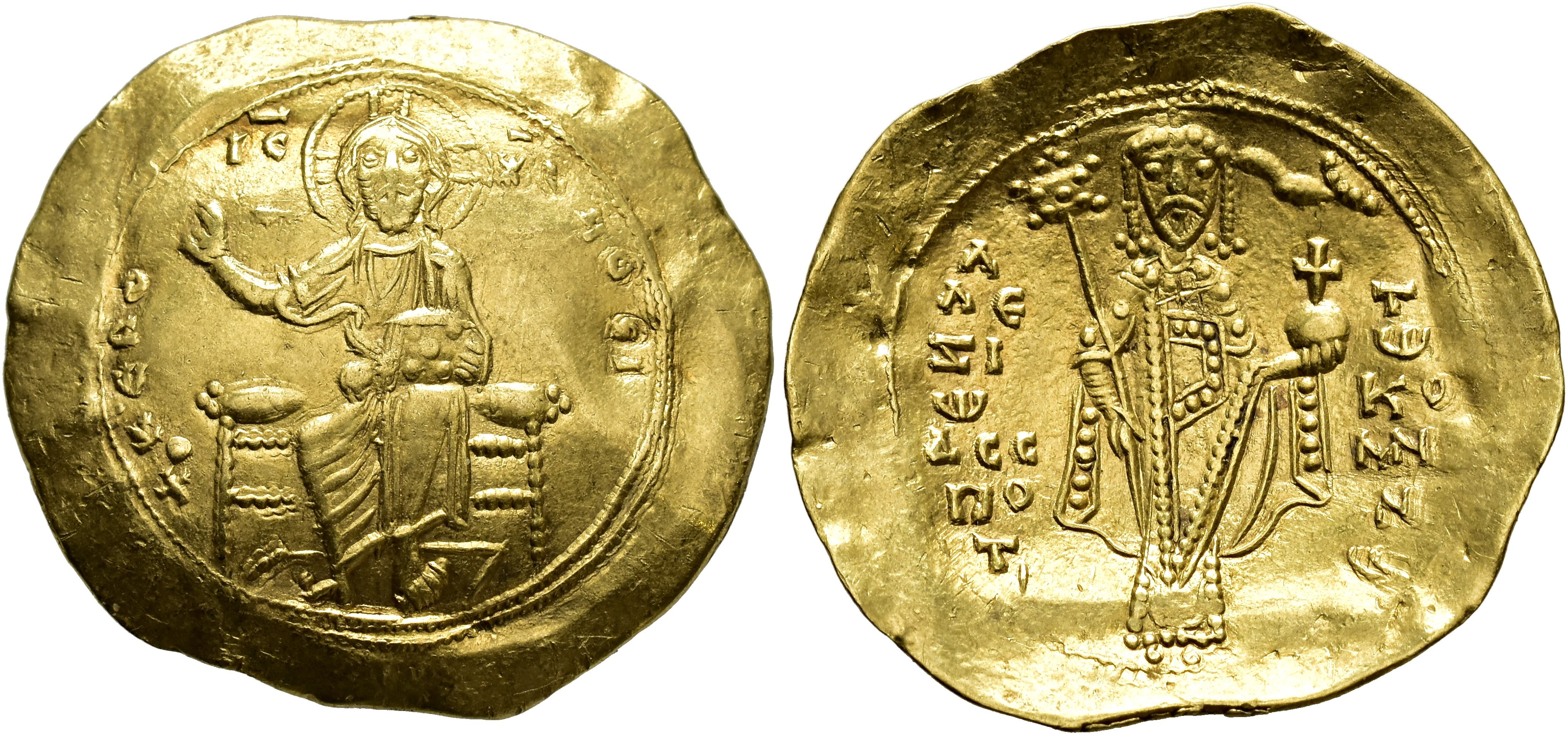 IMPERIO BIZANTINO. ALEJO I (1092-1118). Hyperpyron. Constantinopolis. A/ Cristo en majestad. R/ El emperador con labarum y globo crucífero. AU 4,37 g. 25,1 mm. SBB-1912. Algo alabeada. MBC/EBC-.
