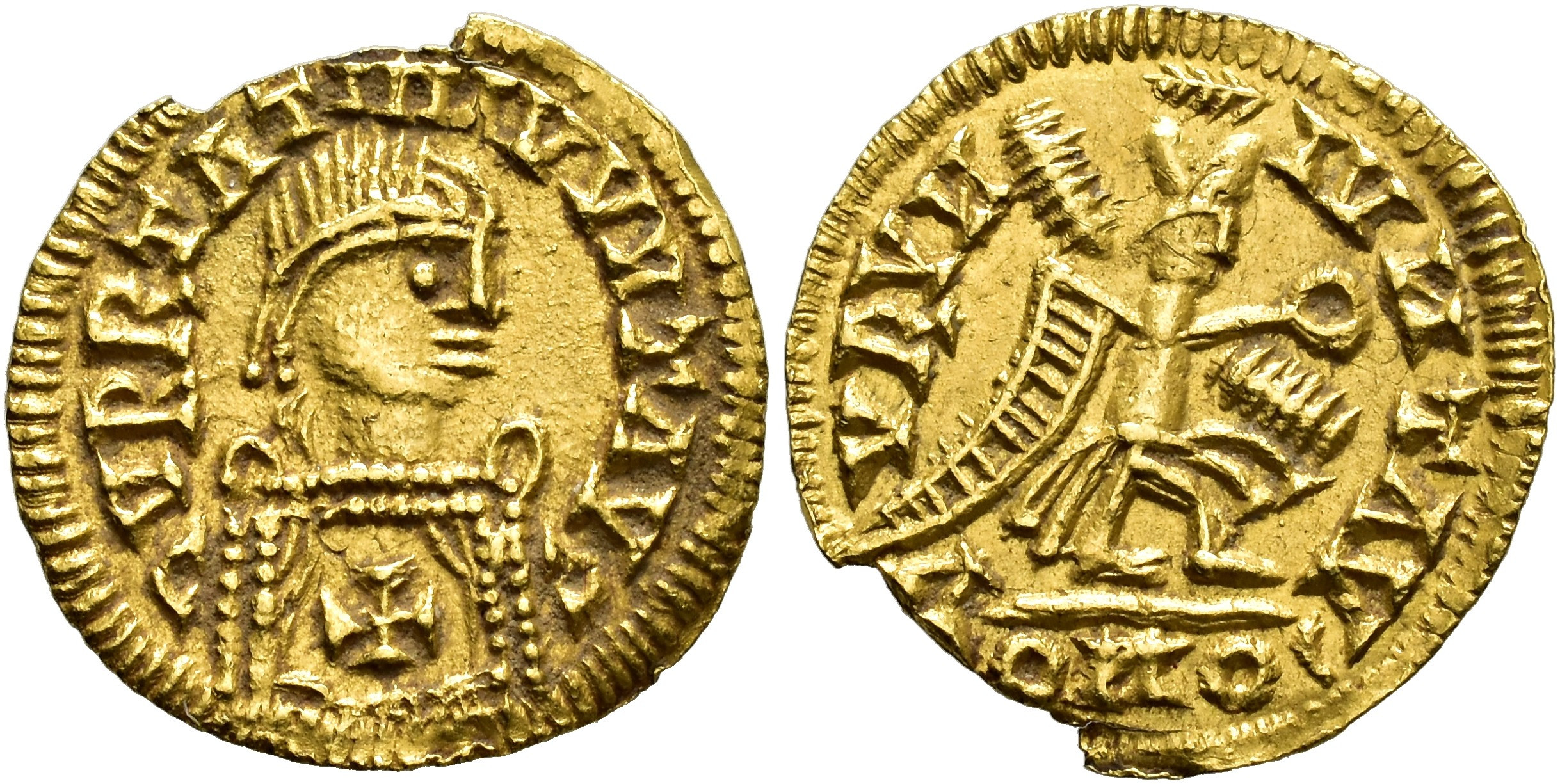REYES VISIGODOS. Tremissis. Tipo "Curru". A/ Busto a der. R/ Victoria a der. AU 1,39 g. 15,9 mm. Tomasini-Grupo C 5. Falta fragmento. MBC+. Rara.