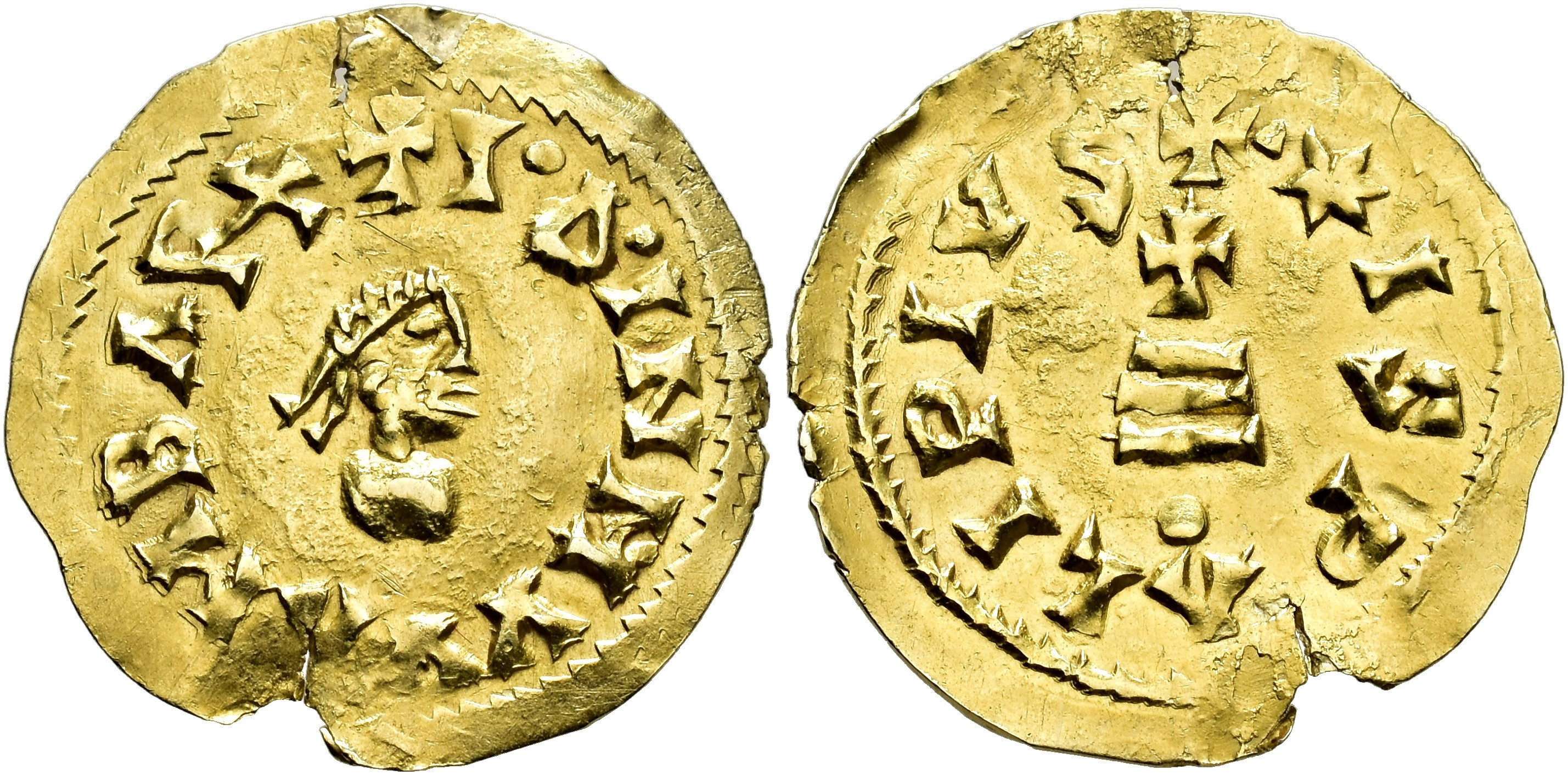 REYES VISIGODOS. WAMBA. Tremissis. Ispali. AU 1,47 g. 19,5 mm. CNV-474. Rotura al borde y 2 pequeñas grietas. MBC+. Muy escasa.