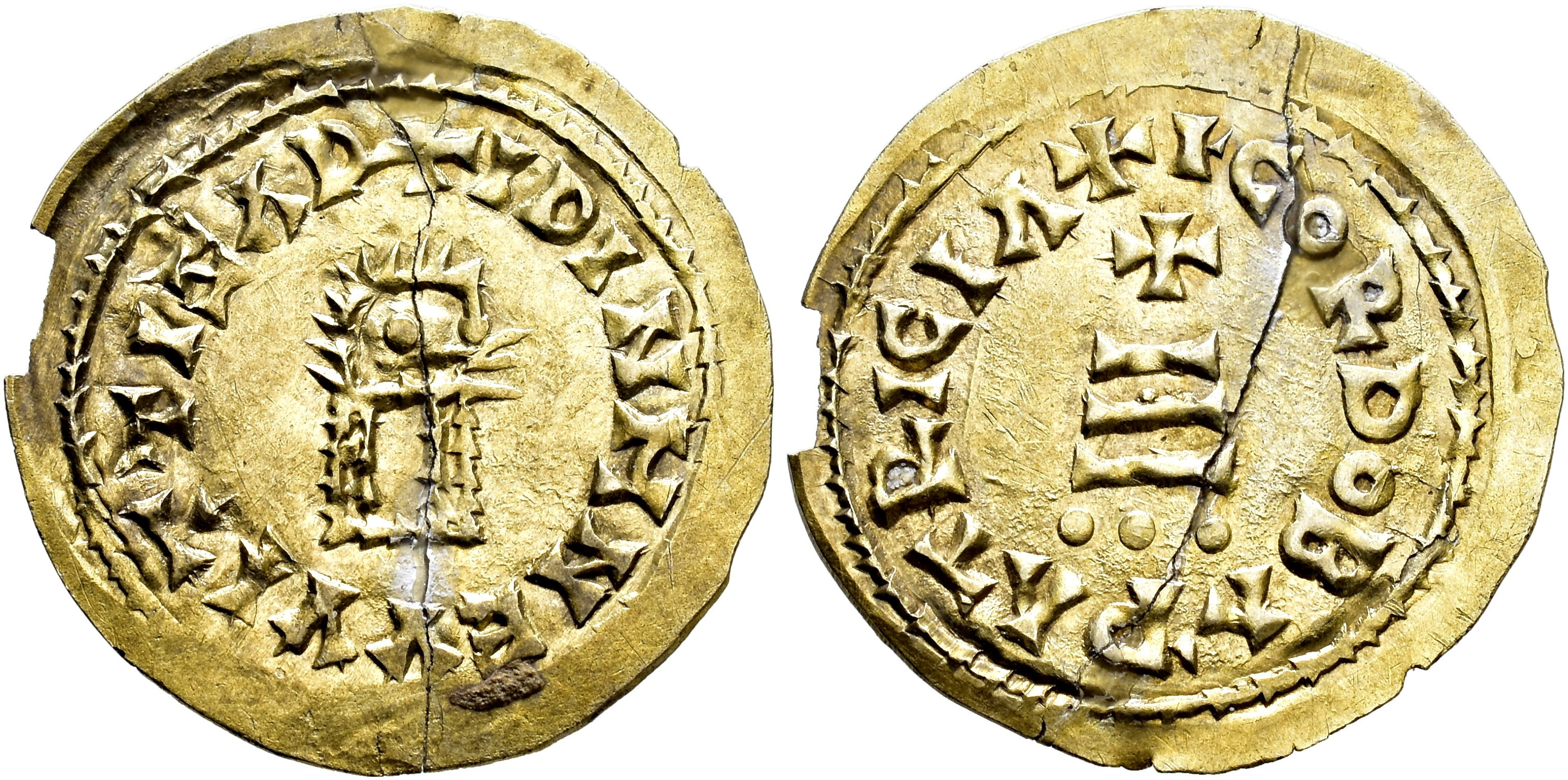 REYES VISIGODOS. WITIZA. Tremissis. Cordoba. AU 1,17 g. 20,8 mm. CNV-593 var. por primer signo ley. rev. Pequeña rotura al borde. Grieta longitudinal. Rota en dos partes y pegada. MBC+.