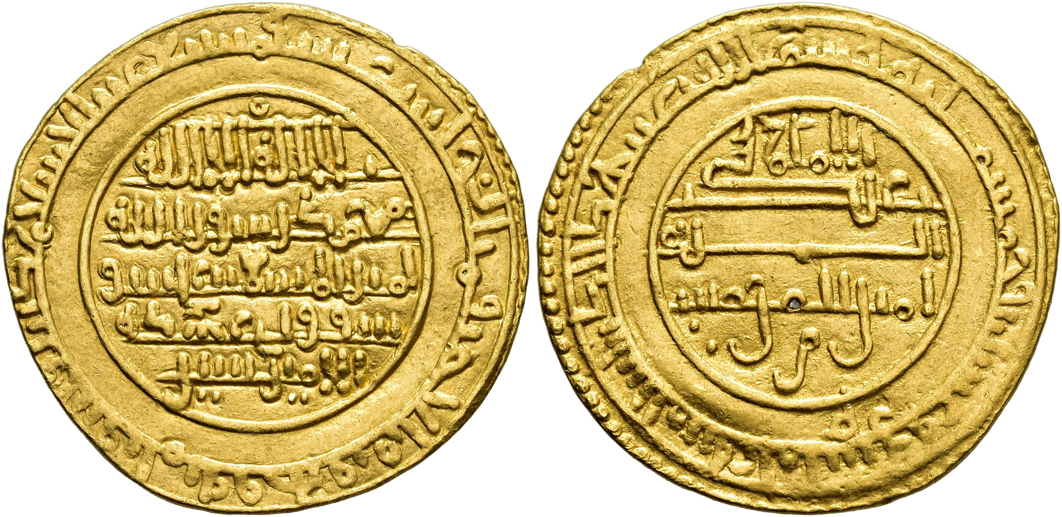 ACUÑACIONES HISPANO-ÁRABES. ALMORÁVIDES. Ali b. Yusuf y Amir Sir. Dinar. 522 H. Almería. AU 4,12 g. 24,9 mm. V-1741. Pequeña muesca en canto. MBC+.