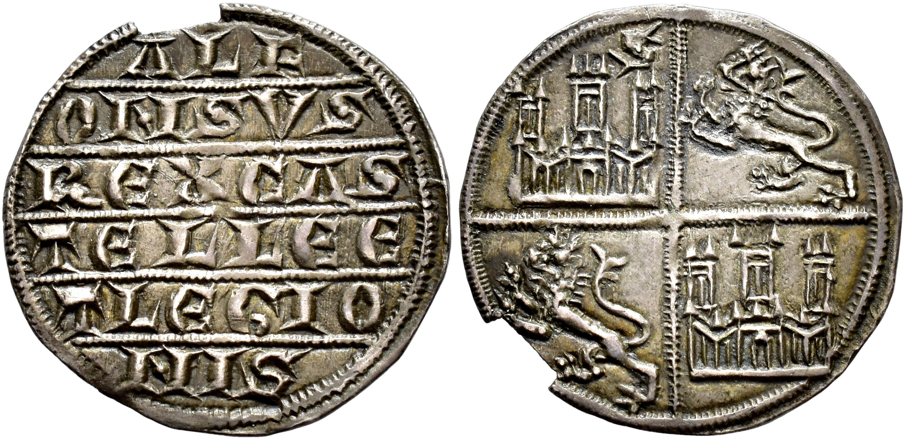 REINOS DE CASTILLA Y LEÓN. ALFONSO X (1252-1284). 1/4 maravedí. Sevilla. S en el primer cuartel. AR 1,32 g. 20,1 mm. III-225; BMM-341. Pequeña rotura al borde. EBC. Rara.
