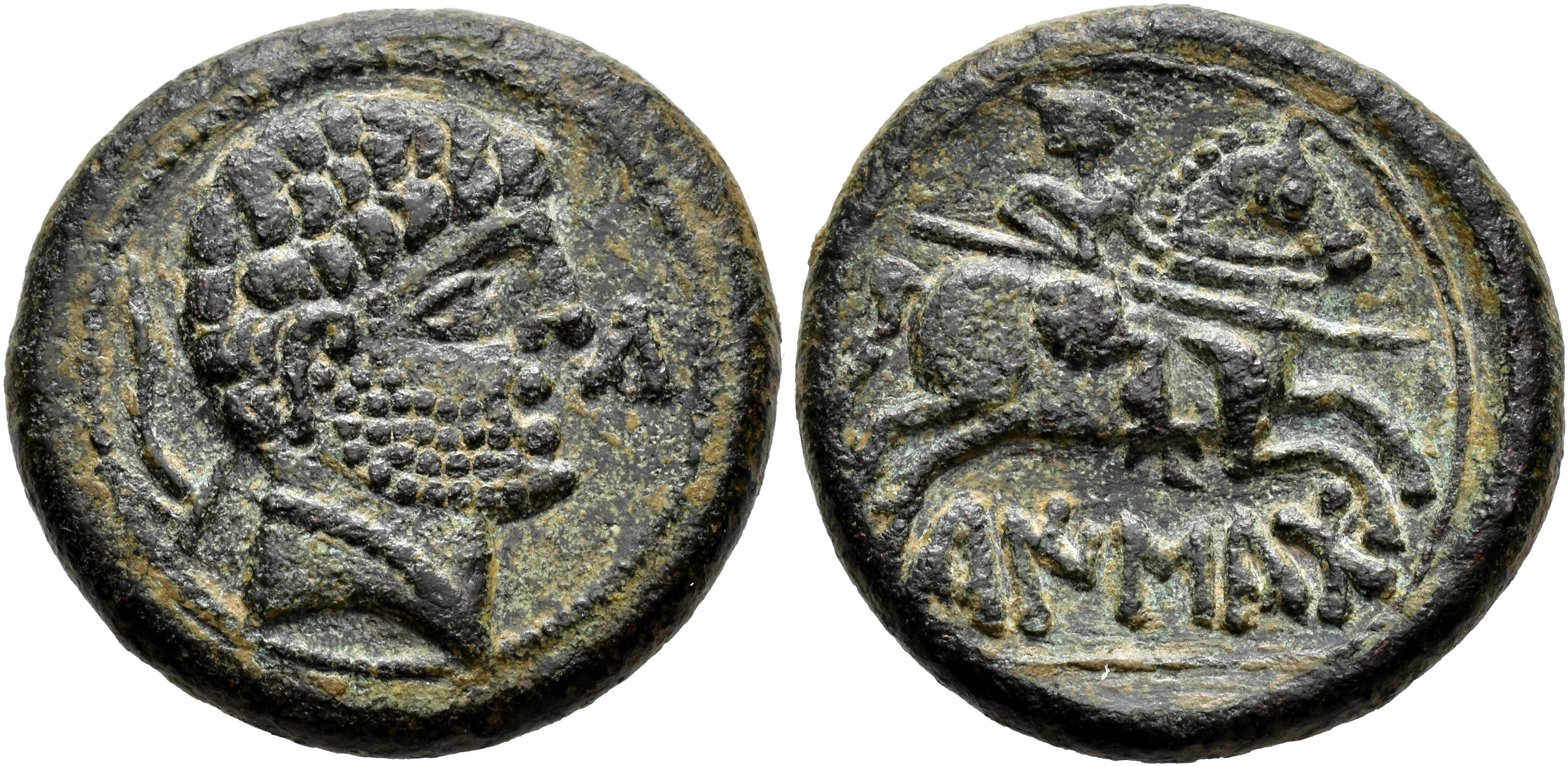 HISPANIA ANTIGUA. KAISKATA. Unidad. A/ Cabeza masculina a der., delante Ka, detrás arado. R/ Jinete con lanza a der., debajo sobre línea KaISKaTa. AE 14,76 g. 27 mm. I-687; ACIP-1682. Pátina verde oscuro. MBC+. Muy escasa.