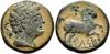 HISPANIA ANTIGUA. KELSE. Semis. A/ Cabeza masculina con manto a der., detrás delfín. R/ Caballo con rienda suelta a der., encima estrella, debajo KeLSE. AE 7,41 g. 21,1 mm. I-784; ACIP-1477, var. ley. Pátina verde terrosa. MBC. Rara.