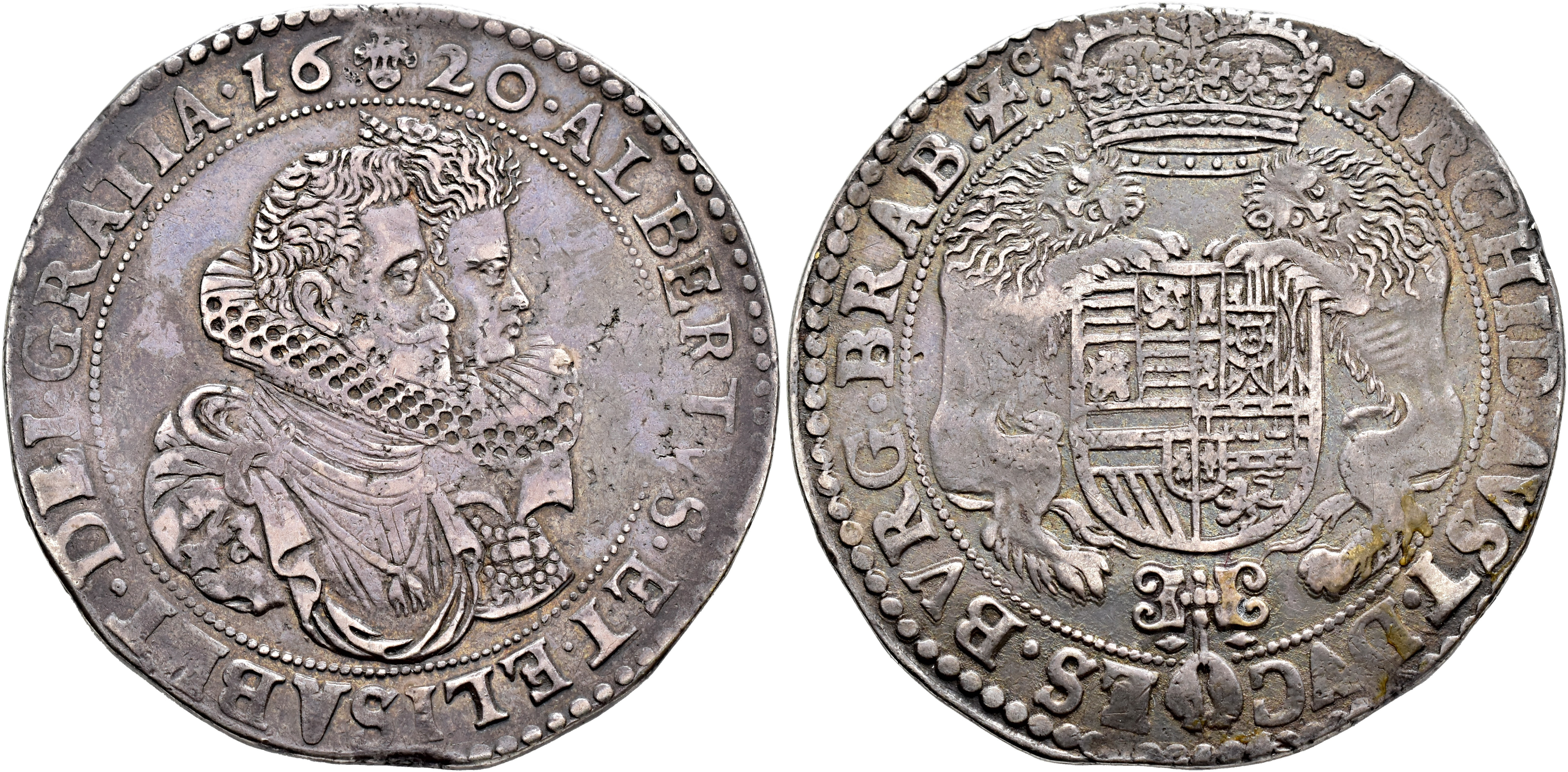 ALBERTO E ISABEL. Ducatón. 1620. Bruselas. AR 32,29 g. 43,4 mm. Vanhoudt-617.BS. Pequeños defectos de cospel. MBC-/MBC.