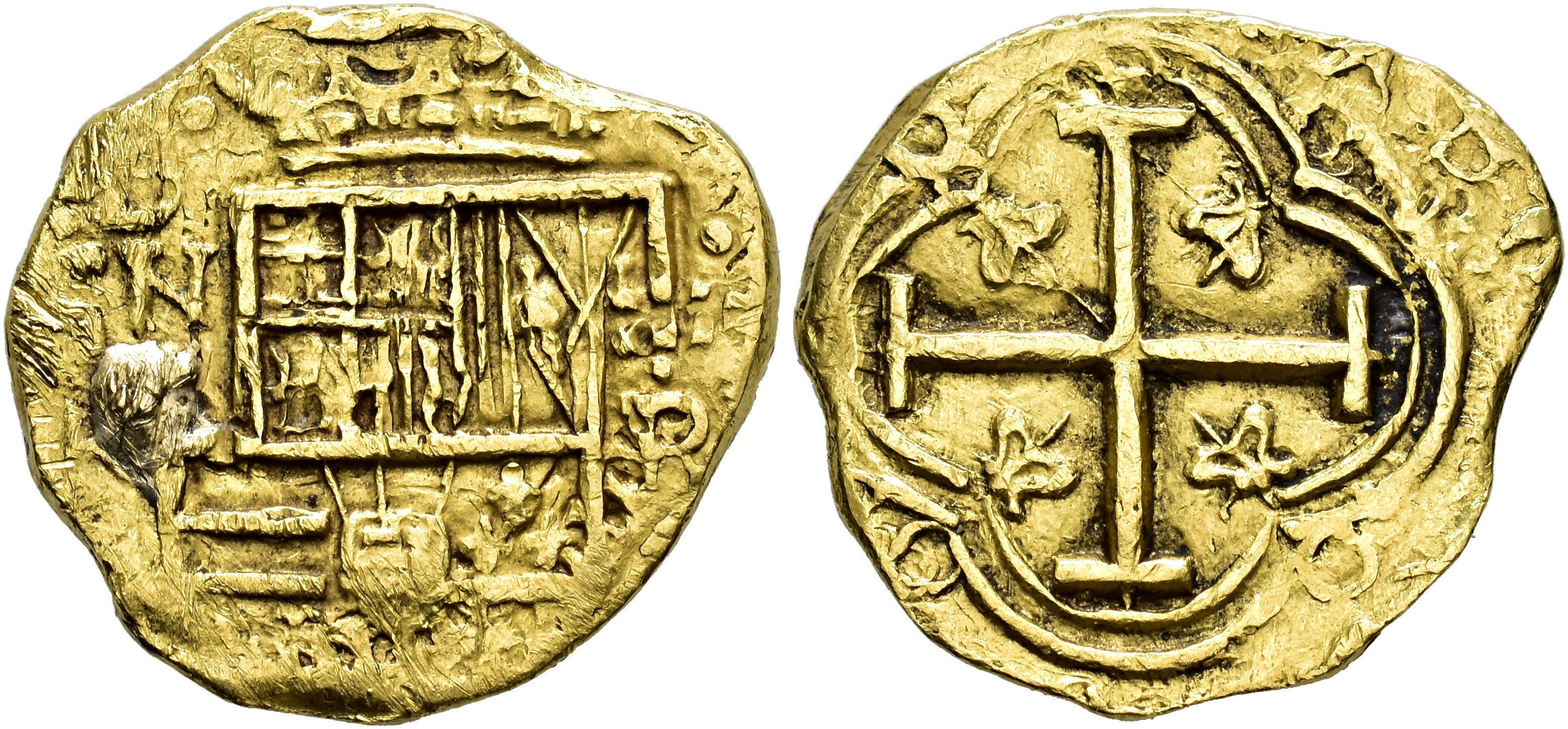 FELIPE IV. 2 escudos. S/F visible. Nuevo Reino. R. AU 6,71 g. 20 mm. AC-tipo 386. Pegote de soldadura sobre la R de Nuevo Reino en anv. Pequeñas marcas. MBC. Escasa.