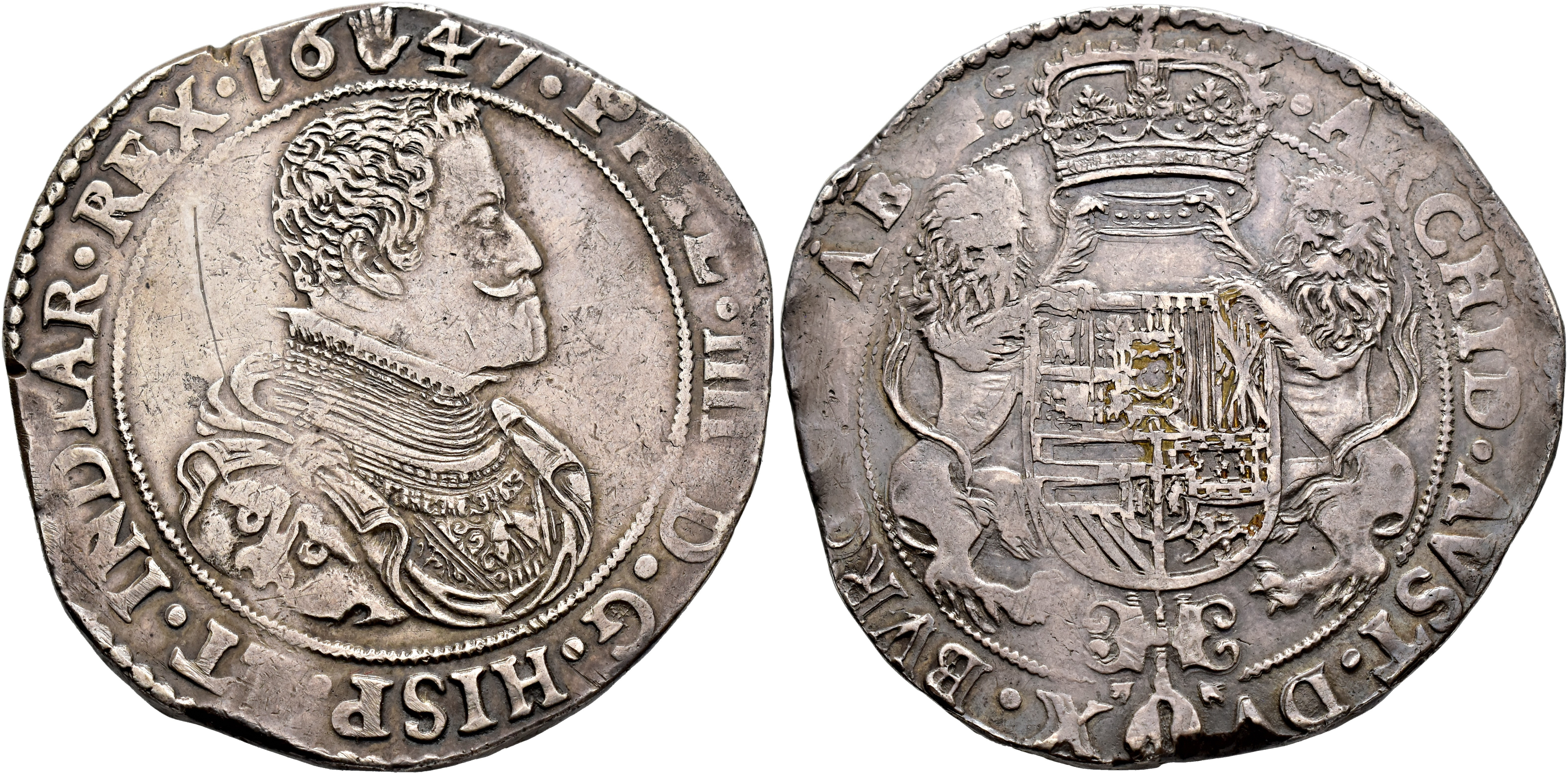 FELIPE IV. Ducatón. 1647. Amberes. AR 32,3 g. 42,8 mm. Vanhoudt-642.AN. Fina raya en anv. MBC.