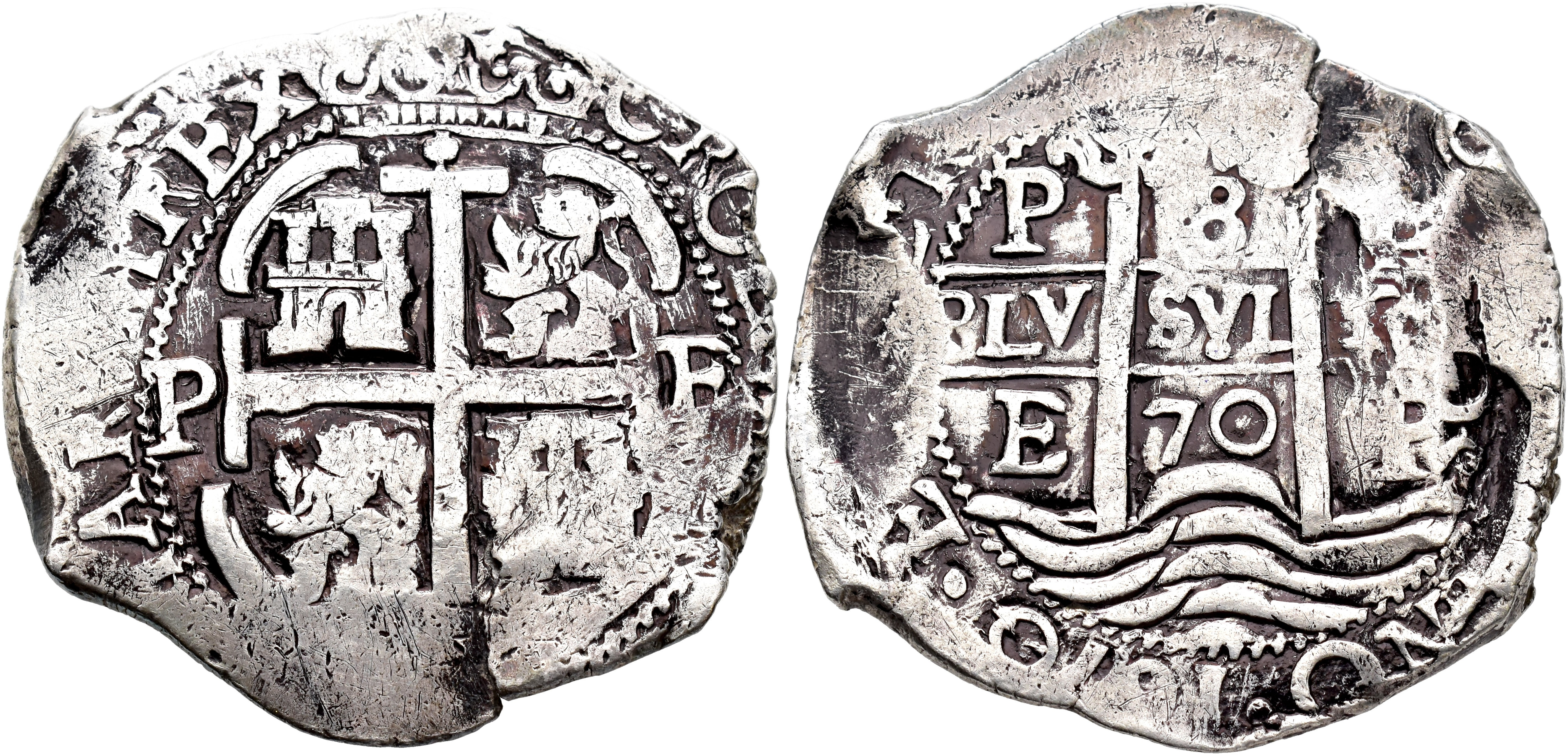CARLOS II (1665-1700). 8 reales. Potosí. 1670. E. Nombre de rey CROL. AR 26,06 g. 37,1 mm. Calbetó-1070; AC-701 var. Grieta. MBC-. Muy escasa.