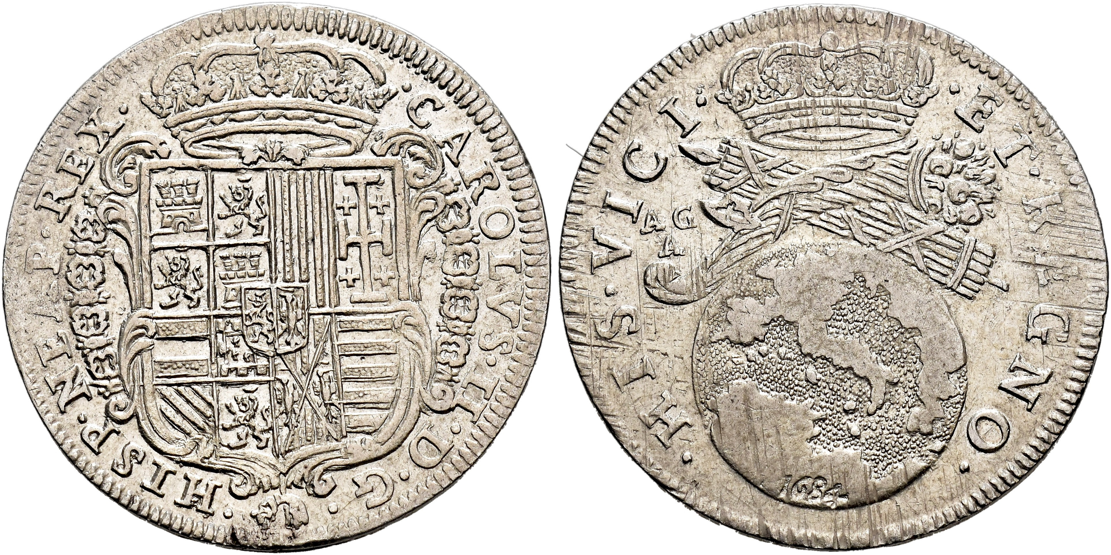 CARLOS II. Tarí. 1684. Nápoles. AR 5,57 g. 26,4 mm. MIR-298. Rayas de ajuste. EBC/MBC+.