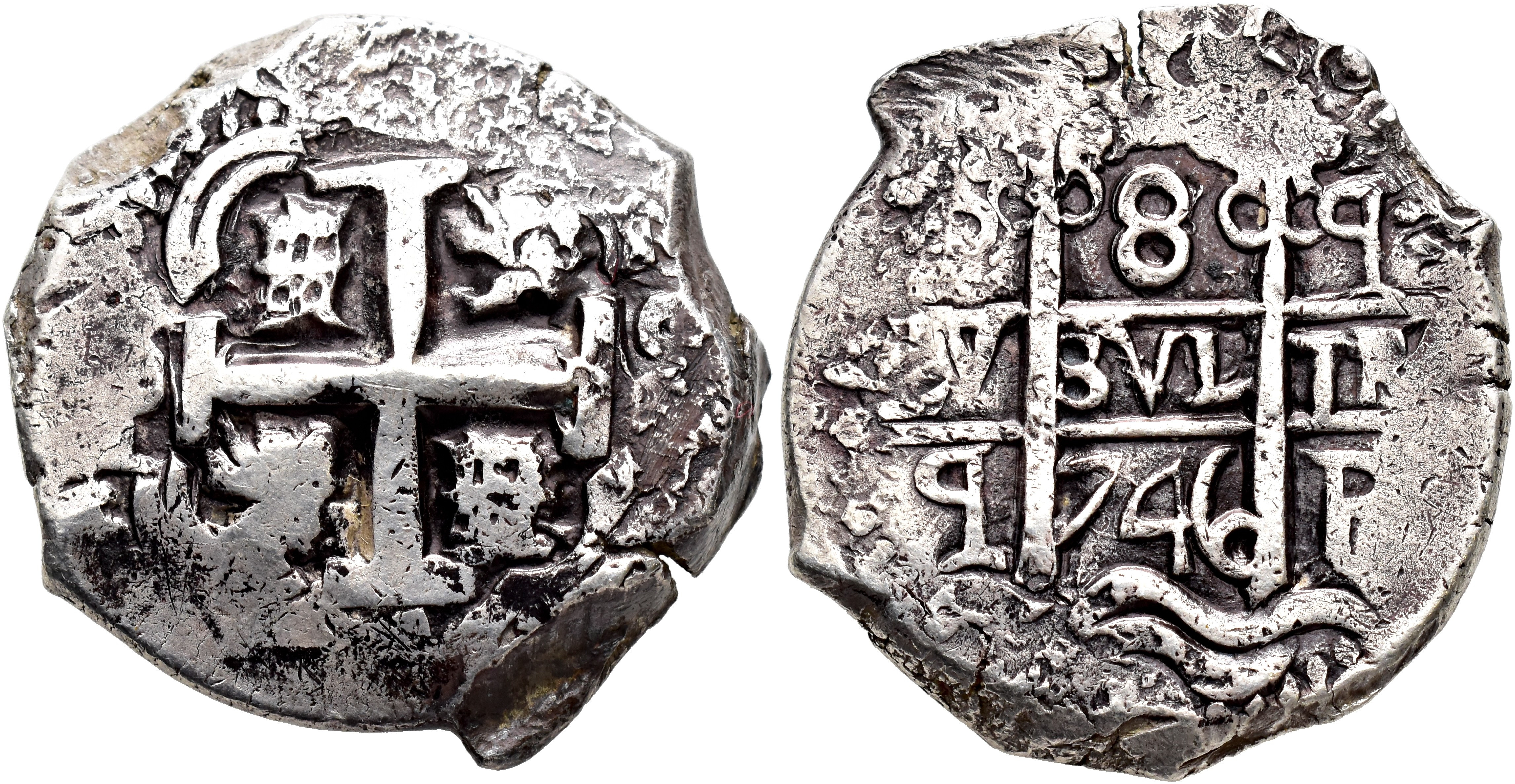 FELIPE V. 8 reales. Potosí. 1746. q. AR 26,81 g. 31,6 mm. Calbetó-1198; VI-1243; AC-1589. Leves erosiones. MBC.