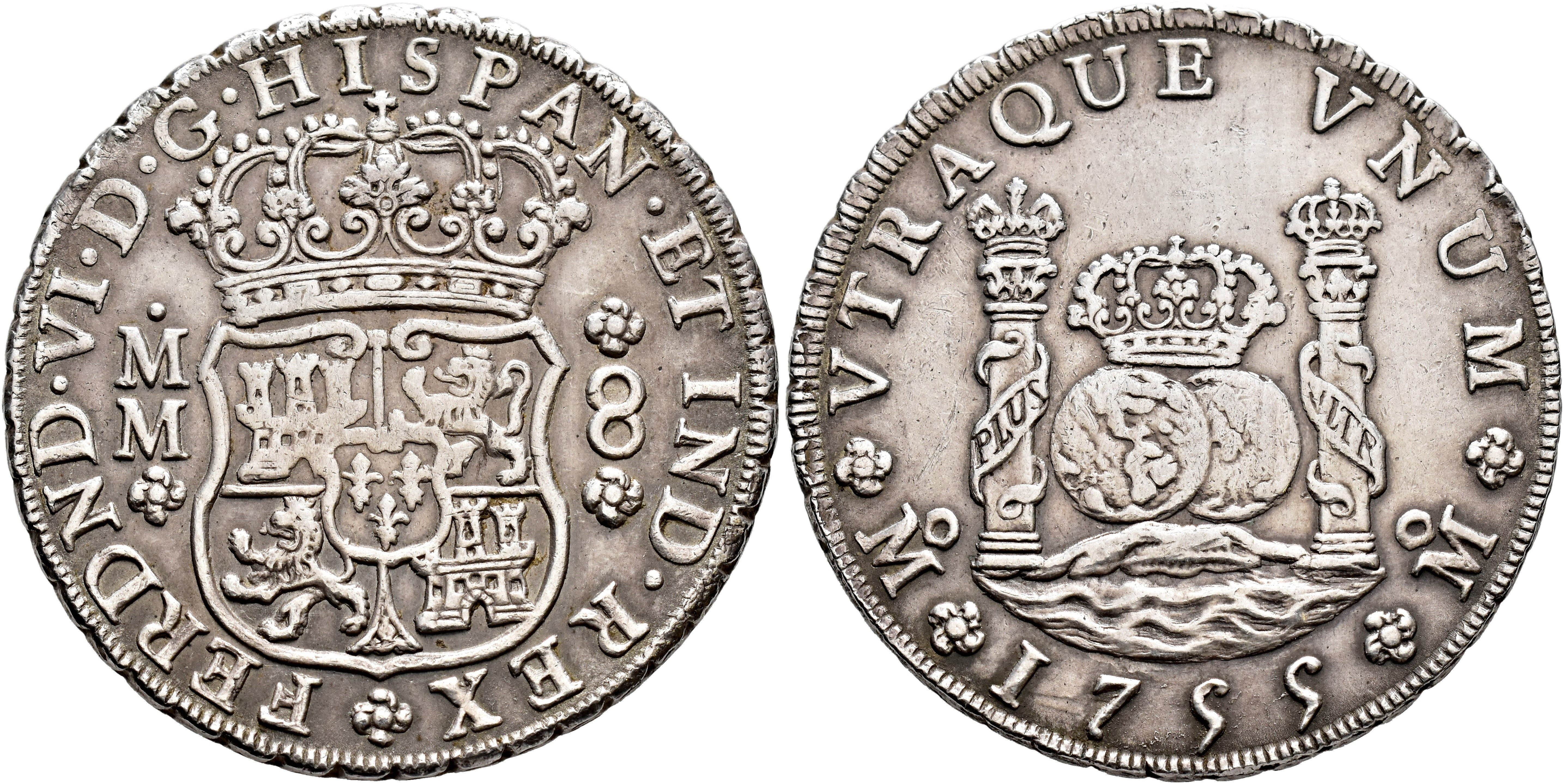 FERNANDO VI. 8 reales. 1755. México. MM. AR 27,06 g. 39,7 mm. VI-366; AC-489. Pequeñas marcas. MBC/MBC+.