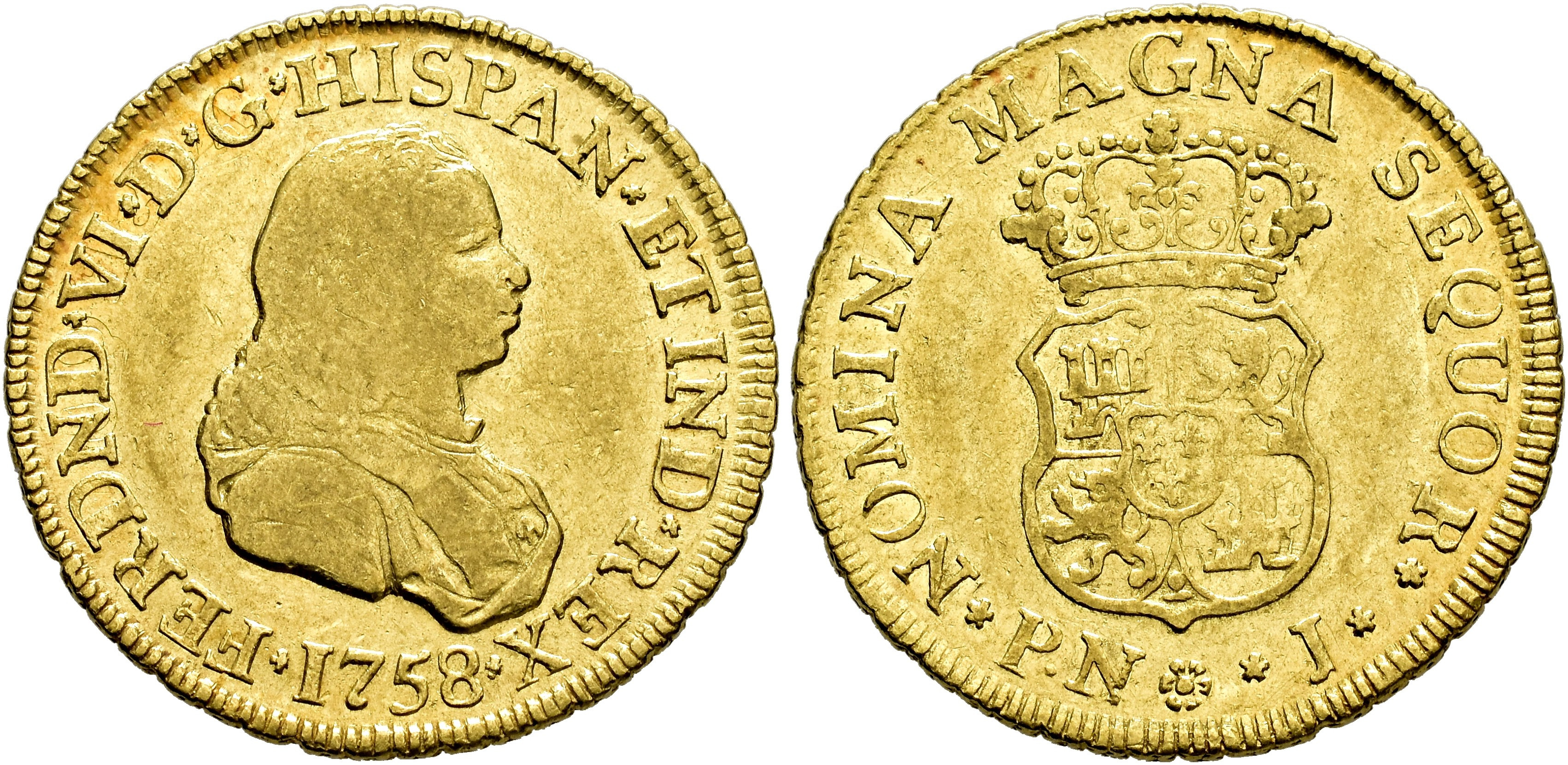 FERNANDO VI. 2 escudos. 1758. Popayán. J. AU 6,68 g. 22,9 mm. VI-519; AC-662. BC+/MBC-. Escasa.