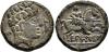 HISPANIA ANTIGUA. EKUALAKOS. Unidad. A/ Cabeza masculina con collar a der., delante delfín, detrás E. R/ Jinete lancero a der., debajo sobre línea EKuALAKoS. AE 9,6 g. 24,1 mm. I-969; ACIP-1849. Pátina verde oscuro. MBC. Muy escasa.