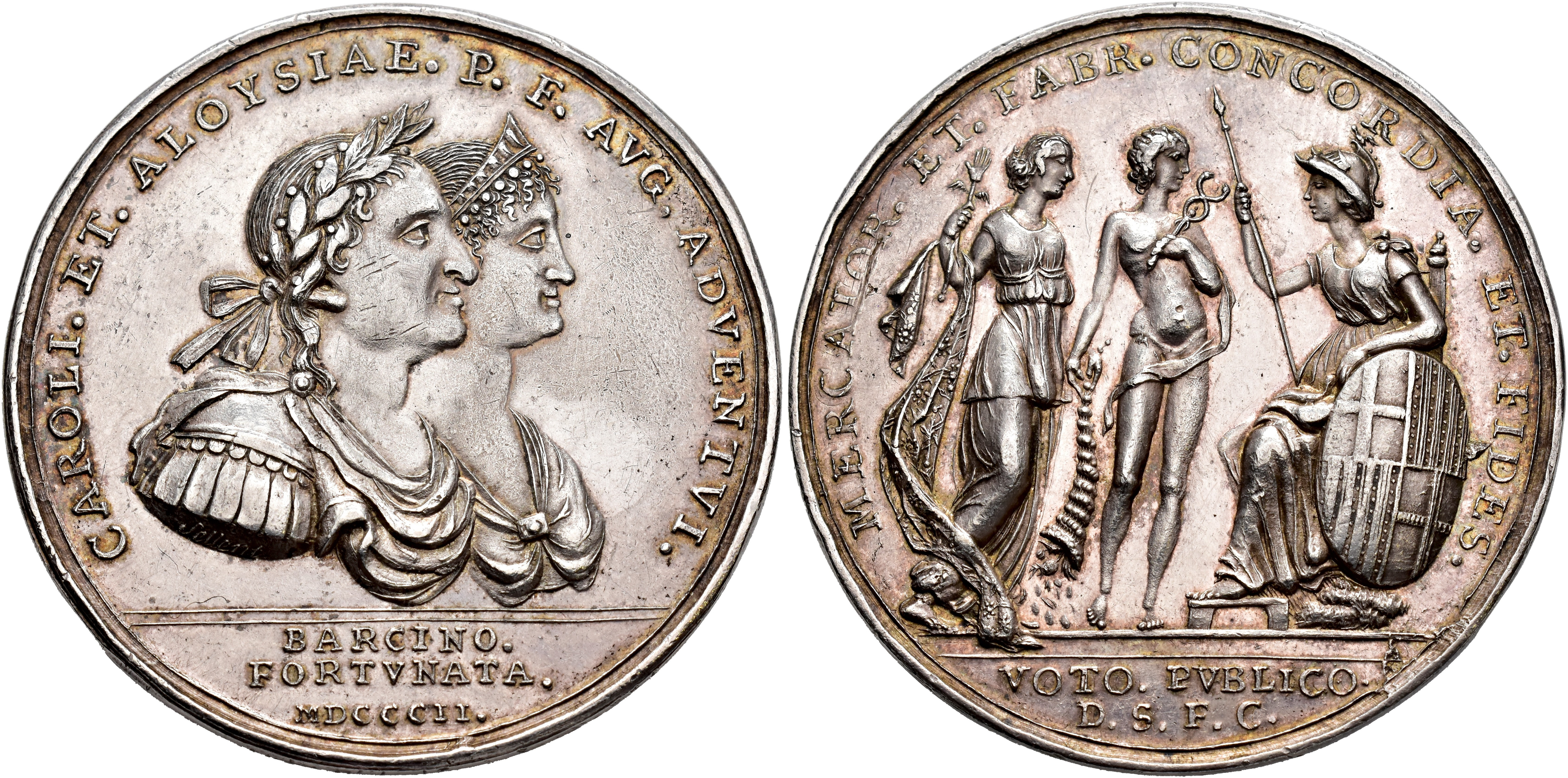 CARLOS IV. Medalla. 1802. Visita de Carlos IV y Mª Luisa a Barcelona. AR 39,2 g. 46 mm. V-Q-14161; Vives-193; RAH-446. Pequeñas marcas. EBC.