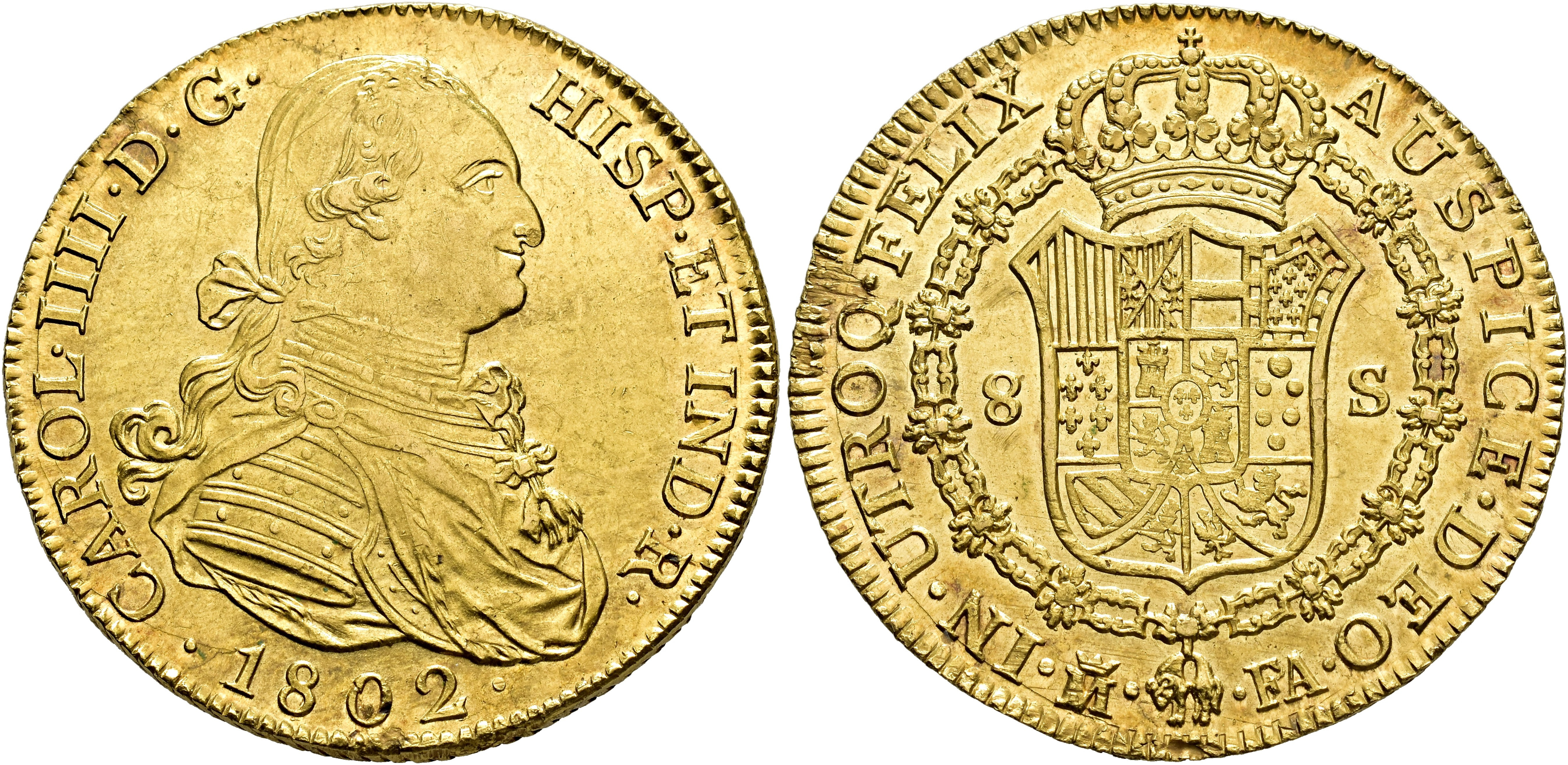 CARLOS IV. 8 escudos. 1802. Madrid. FA. AU 27,1 g. 36,4 mm. VI-1321; AC-1621. Mínima hojita en la nariz y hoja en la gráfila de rev. B.O. EBC/EBC+.