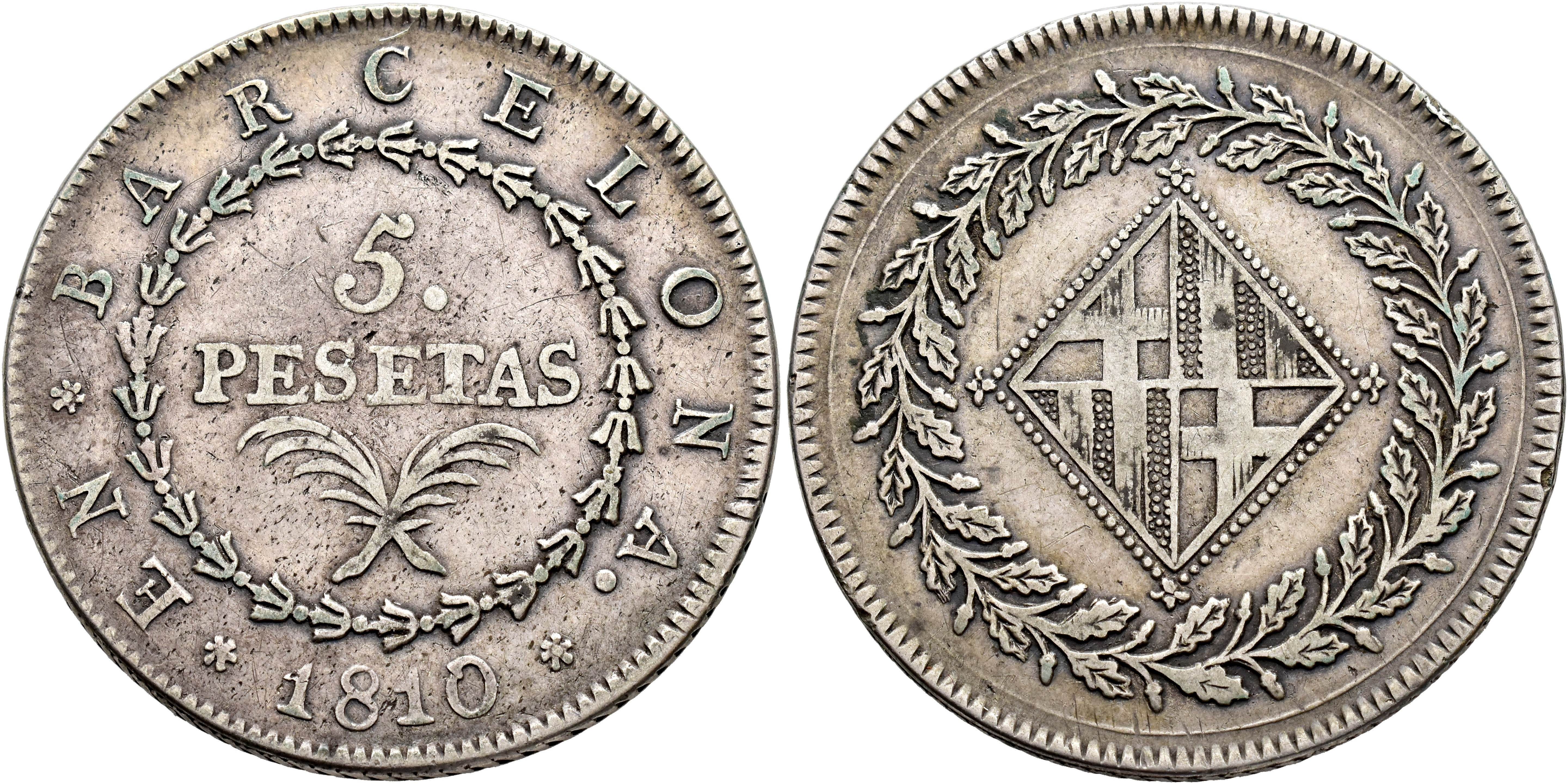 OCUPACIÓN NAPOLEÓNICA DE CATALUÑA. 5 pesetas. 1810. Barcelona. AR 26,64 g. 39,8 mm. VI-35; AC-46. Pequeñas marcas. MBC-/MBC.