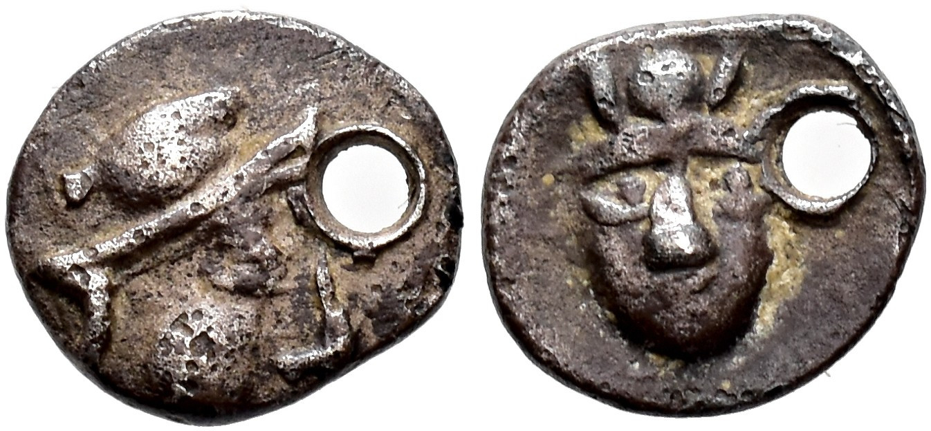 HISPANIA ANTIGUA. DIVISORES IBÉRICOS INCIERTOS. Óbolo. A/ Cabeza con casco a der. R/ Cabeza de frente, cubierta con un ¿ureus? AR 0,54 g.8,9 mm. I-no; ACIP-538. Perforada. MBC-/MBC. Rarísima.
