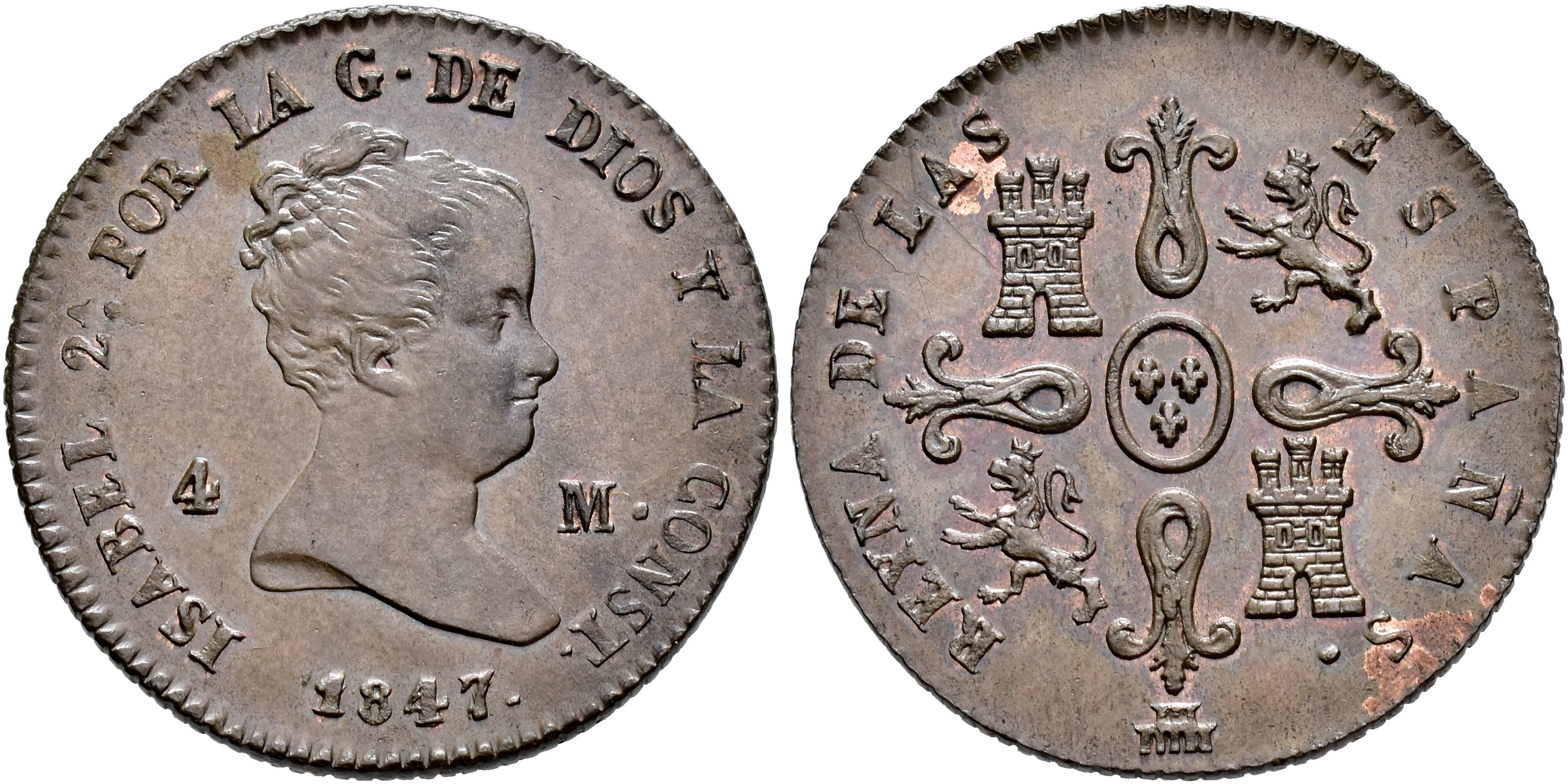 ISABEL II. 4 maravedís. 1847. Segovia. CU 5,05 g. 23,5 mm. VI-55; AC-90. Finas rayitas en rev. EBC+. Escasa.