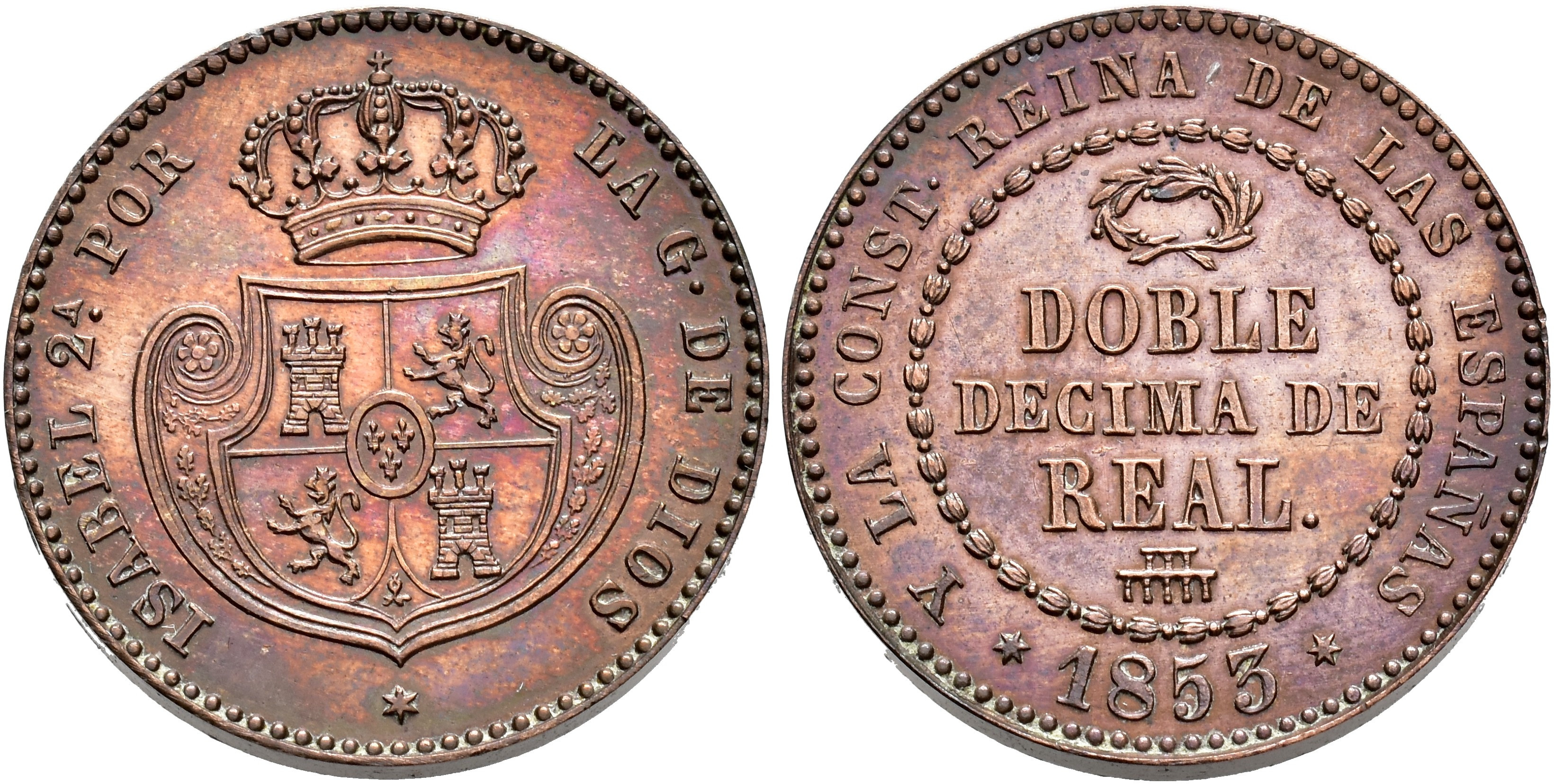 ISABEL II. Doble décima de real. 1853. Segovia. CU 7,41 g. 22,4 mm. VI-109; AC-148. EBC+.