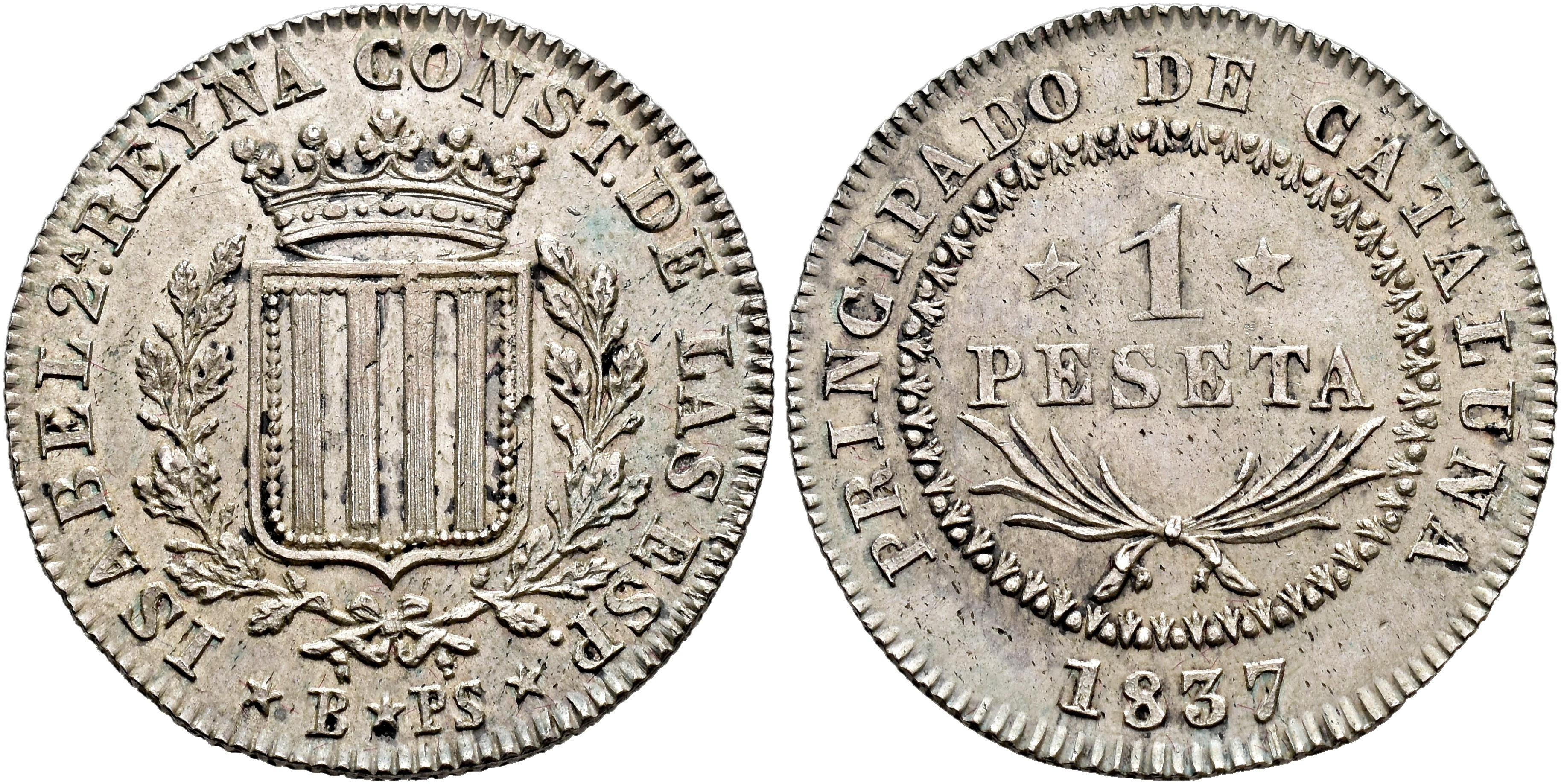 ISABEL II. Peseta. 1837. Barcelona. AR 5,87 g. 25,3 mm. VI-541; AC-272. Pequeñas marcas. R.B.O. EBC-.