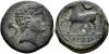 HISPANIA ANTIGUA. IKALESKEN. Semis. A/ Cabeza masculina a der., delante S? y detrás delfín. R/ Caballo al paso a izq., encima creciente, bajo línea ikalesken. AE 4,58 g. 18 mm. I-1401; ACIP-2080. MBC-/BC+. Rara.