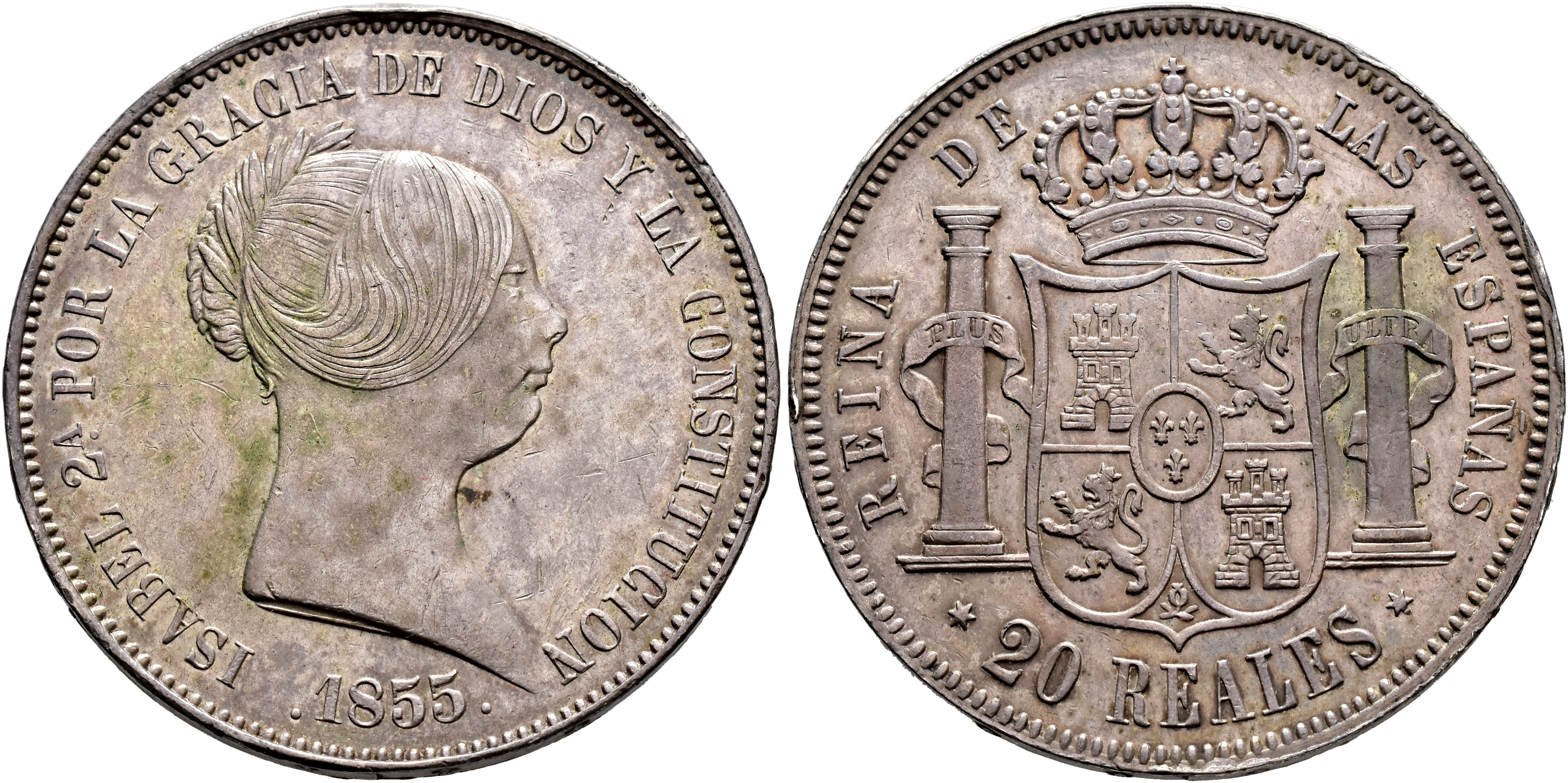 ISABEL II. 20 reales. 1855. Madrid. AR 25,9 g. 37 mm. VI-511; AC-597. Pequeñas marcas. EBC-.