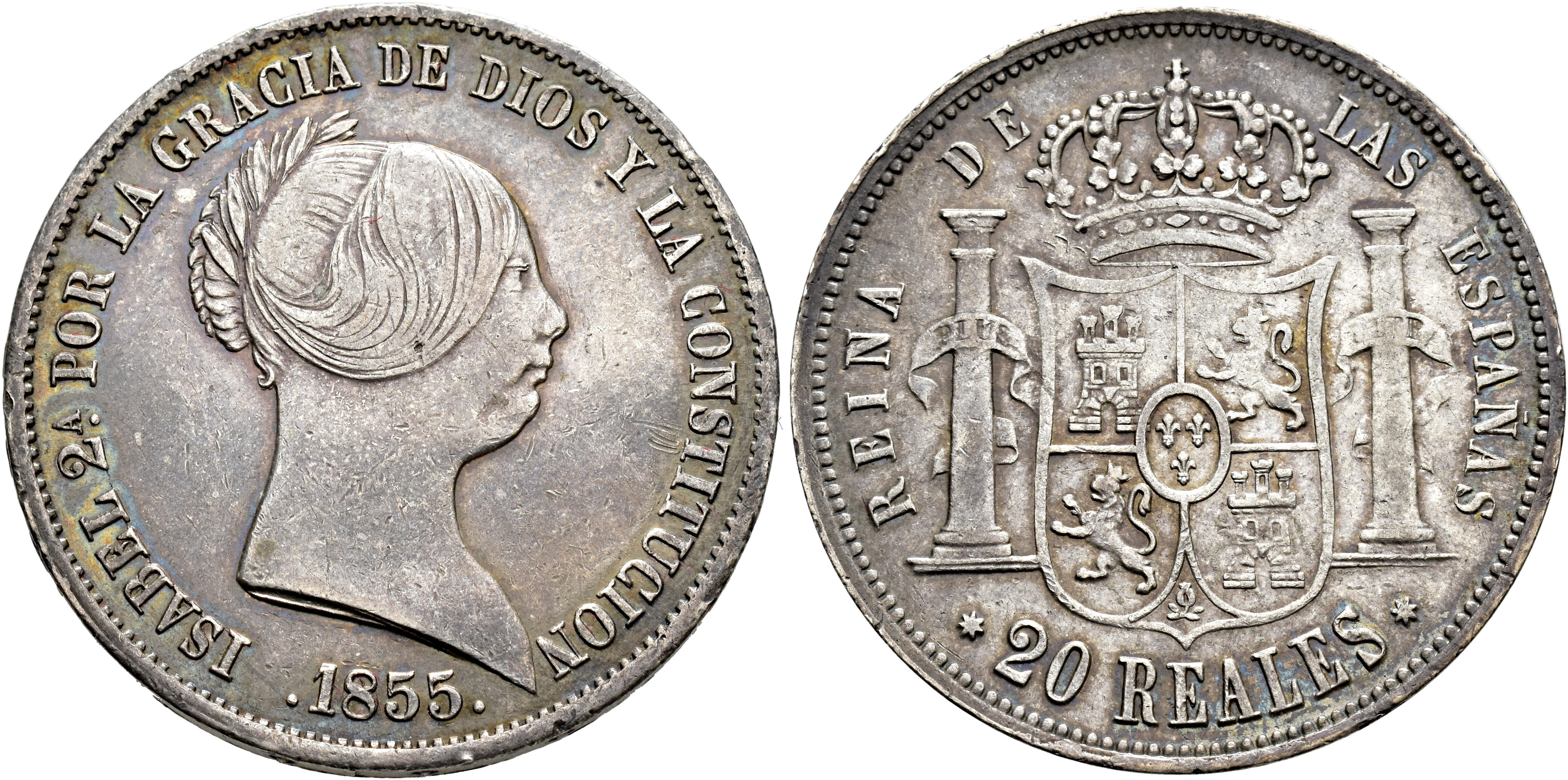 ISABEL II. 20 reales. 1855. Sevilla. AR 25,88 g. 37 mm. VI-527; AC-632. MBC+.