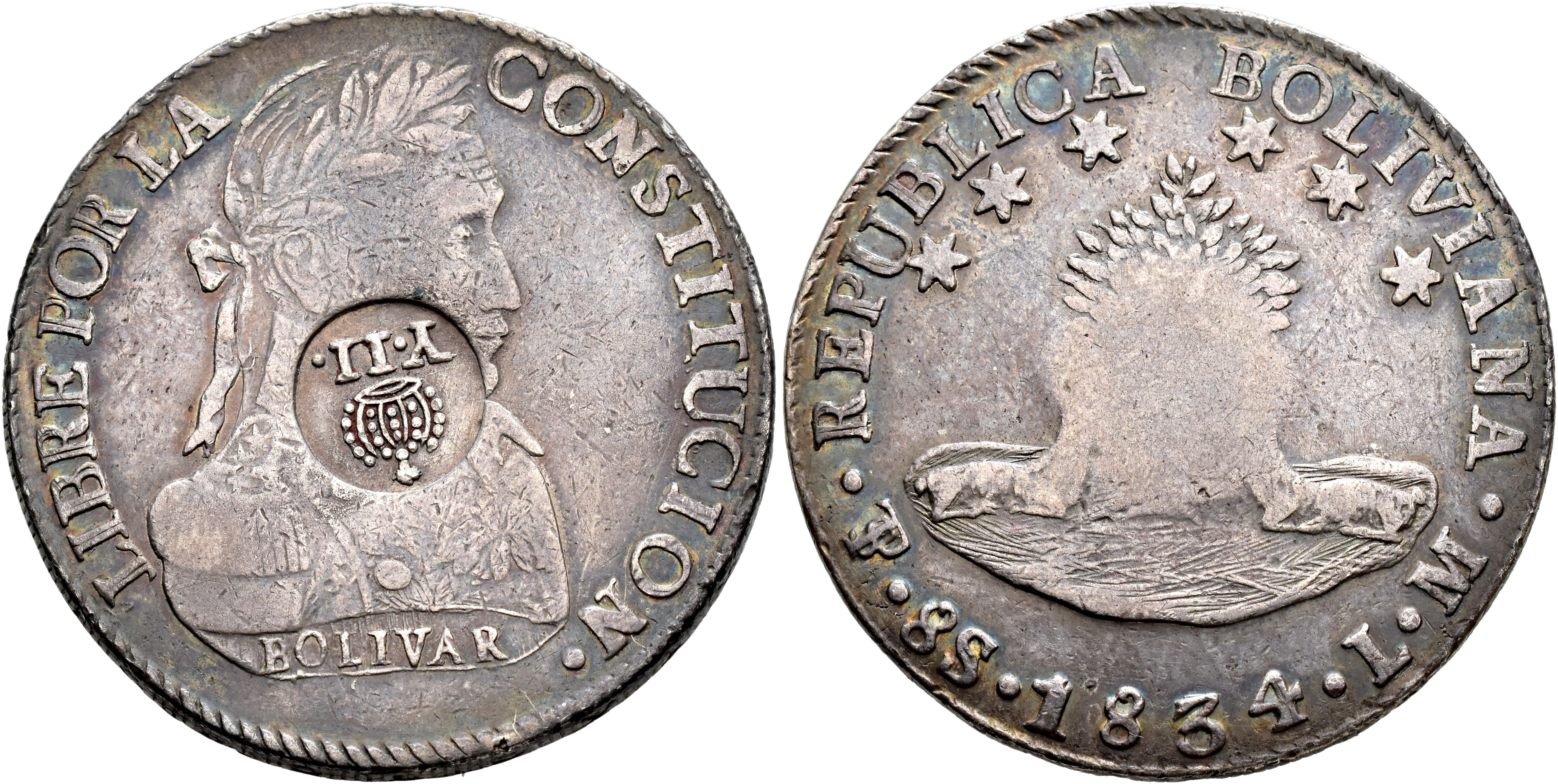 ISABEL II. Resello de Manila Y II coronadas sobre 8 reales 1834 Potosí. AR 27 g. 38,5 mm. VI-p. 462; AC-tipo 175. MBC.