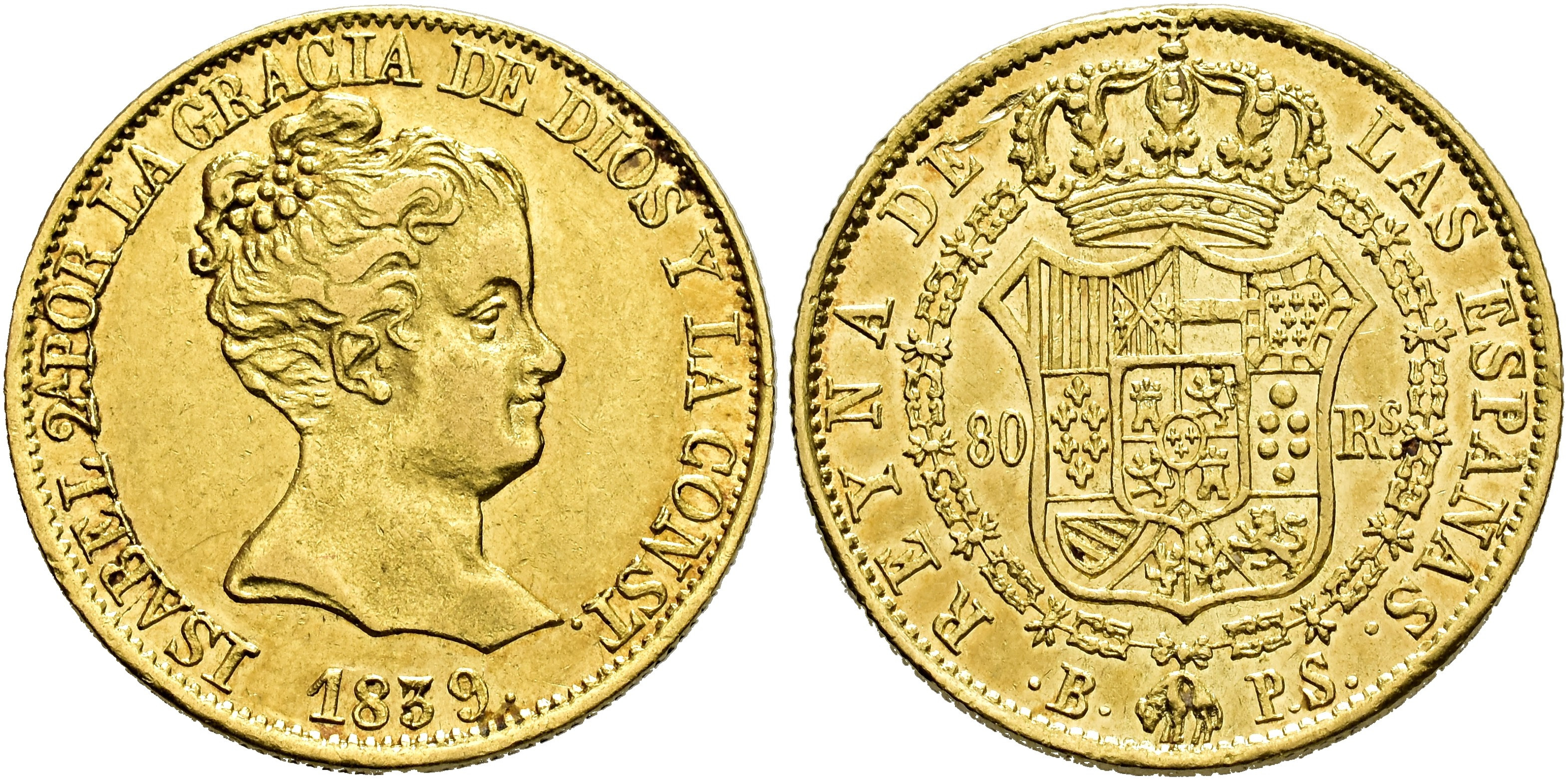 ISABEL II. 80 reales. 1839. Barcelona. PS. AU 6,73 g. 21,4 mm. VI-581; AC-704. R.B.O. EBC-/EBC.