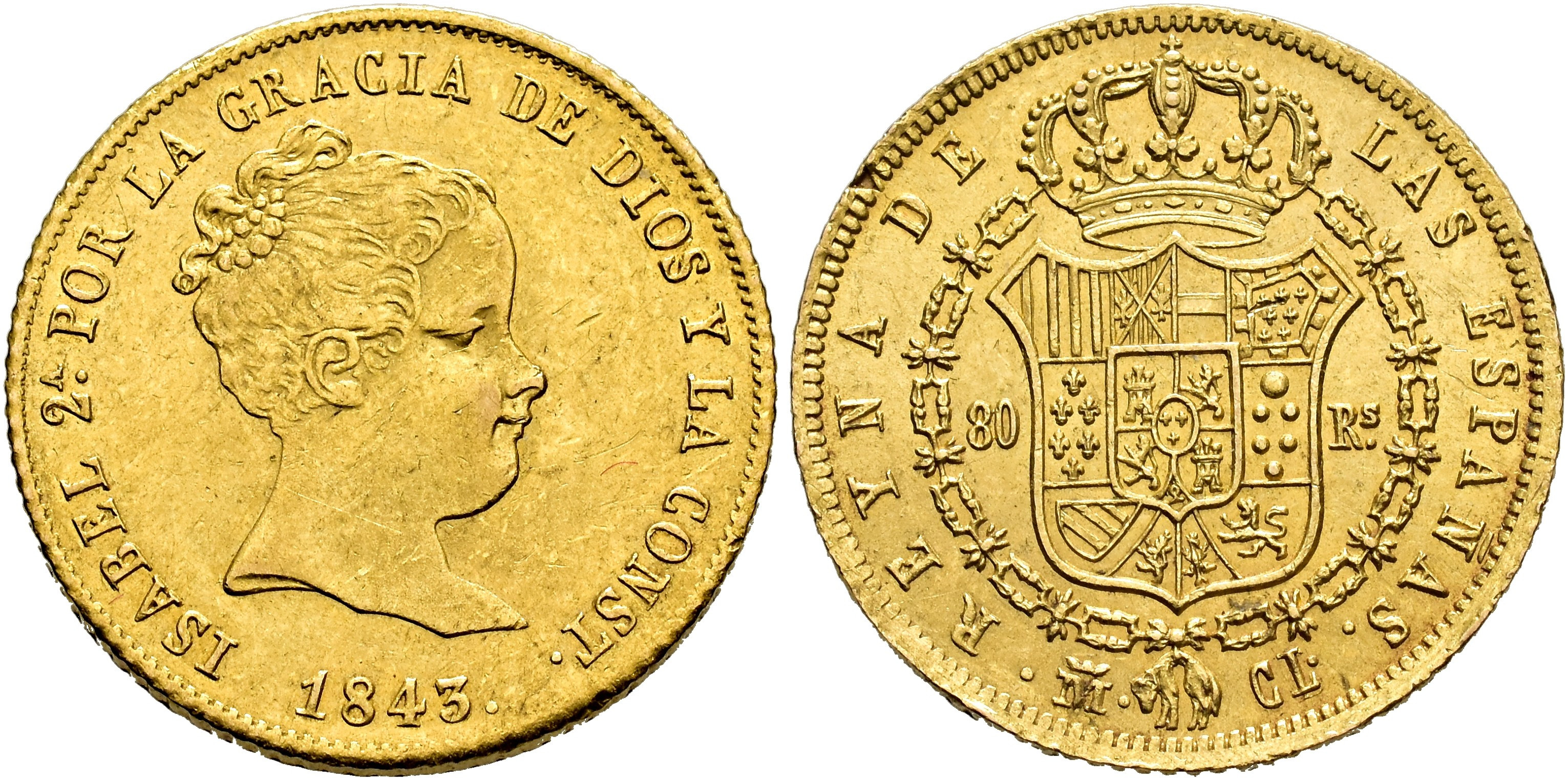 ISABEL II. 80 reales. 1843. Madrid. CL. AU 6,75 g. 20,8 mm. VI-601; AC-730. Pequeñas marcas. EBC-/EBC.