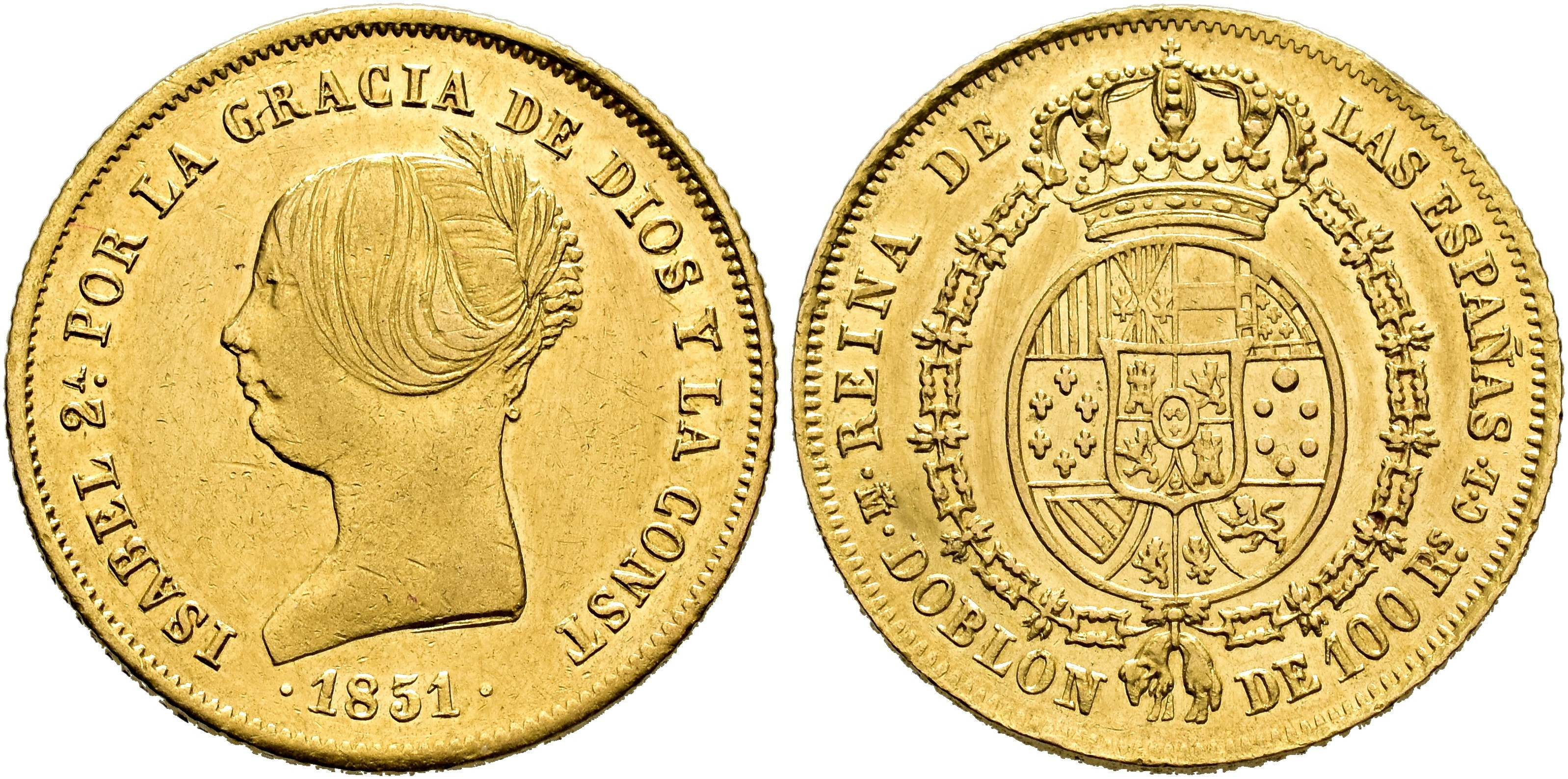 ISABEL II. 100 reales. 1851. Madrid. CL. AU 8,24 g. 21,8 mm. VI-627; AC-758. B.O. EBC-/EBC+. Rara.