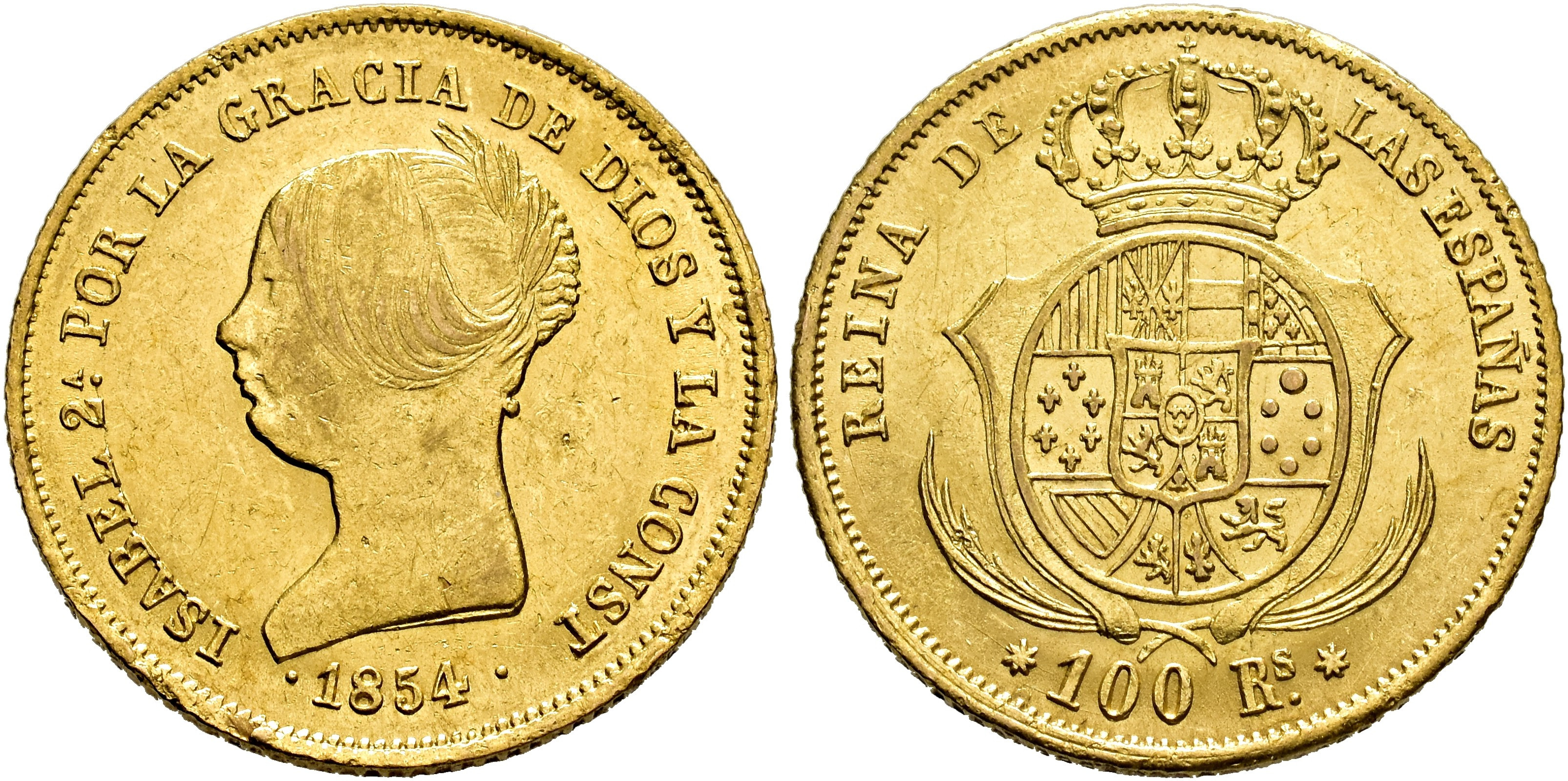 ISABEL II. 100 reales. 1854. Sevilla. AU 8,32 g. 21,8 mm. VI-654; AC-795. Pequeñas marcas. B.O. EBC-/EBC.