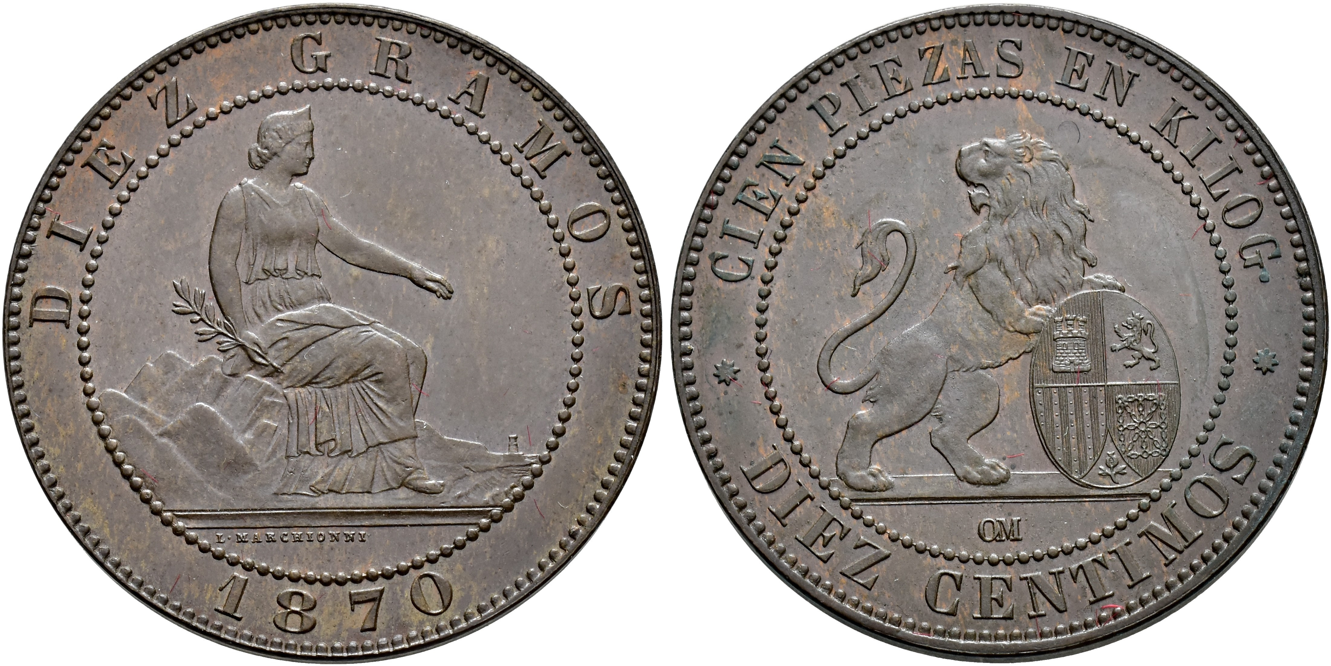 GOBIERNO PROVISIONAL. 10 céntimos. 1870. Barcelona. OM. CU 9,88 g. 30,1 mm. VII-6; AC-8. EBC+.