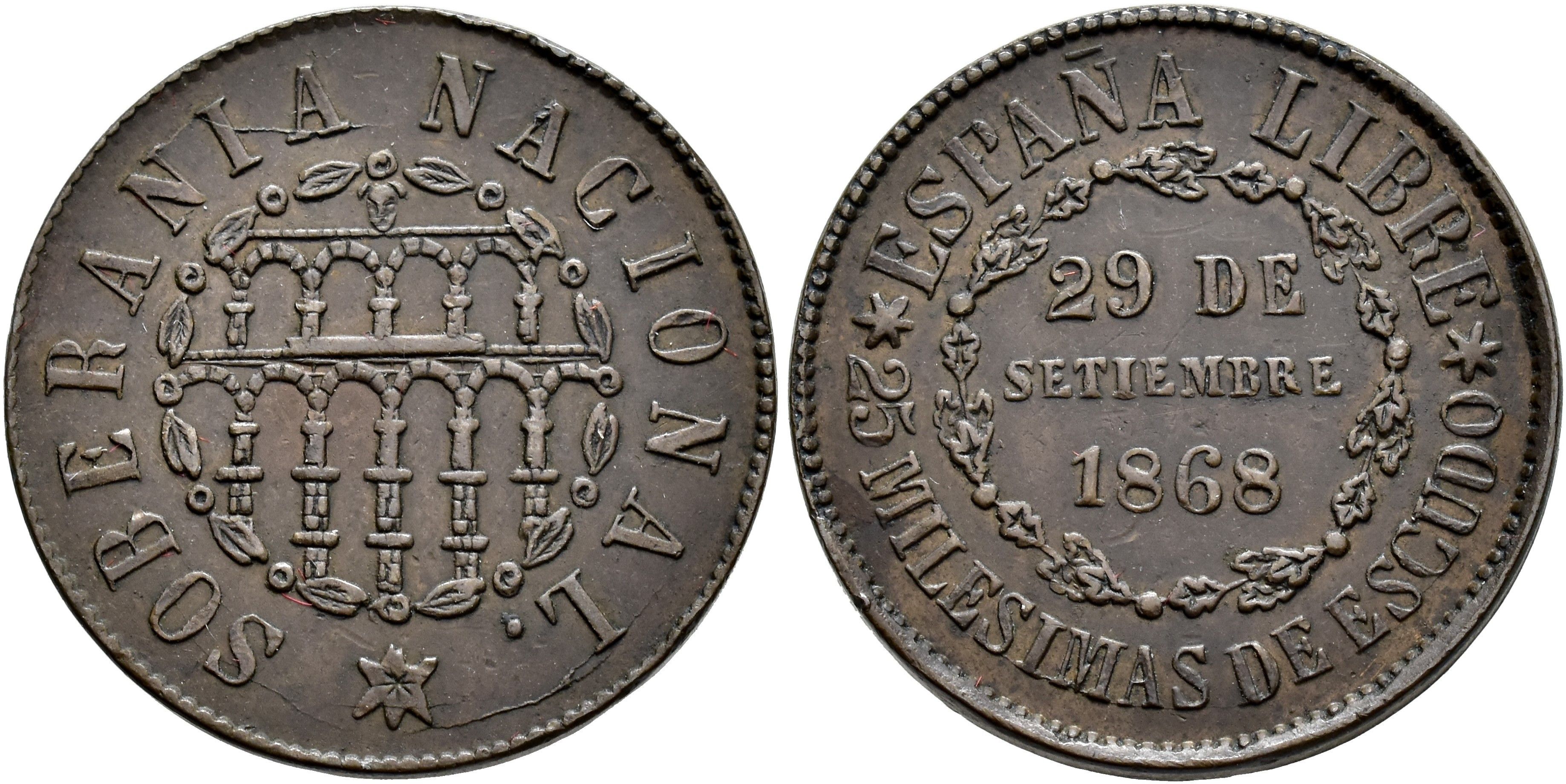 GOBIERNO PROVISIONAL. 25 milésimas de escudo. 1868. Segovia. CU 6,3 g. 25,2 mm. VII-7; AC-10. MBC+/EBC-. Muy escasa.