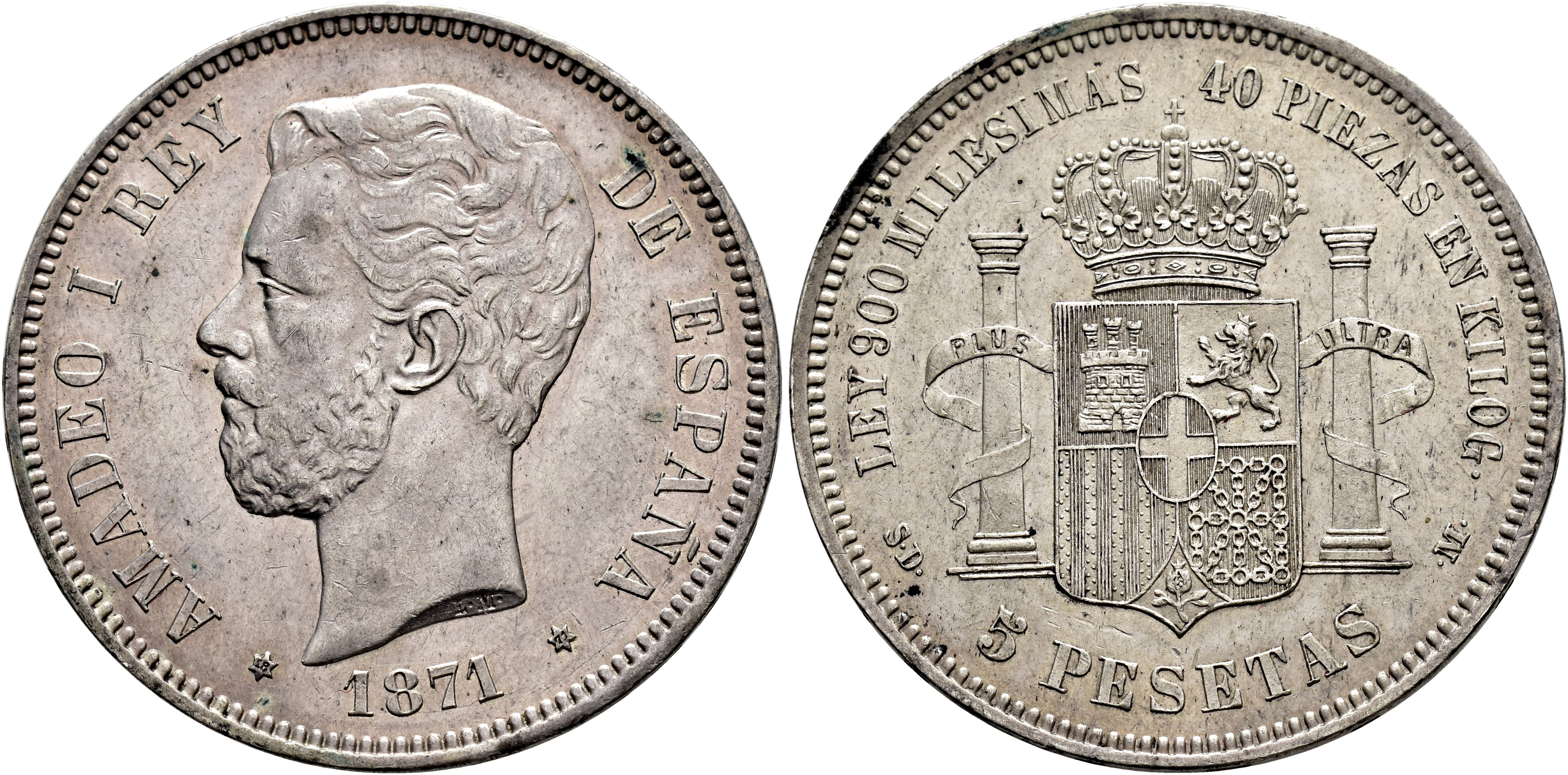 AMADEO I. 5 pesetas. 1871*18-71. Madrid. SDM. AR 25,05 g. 37,3 mm. VII-32; AC-1. Manchitas en el canto. EBC.