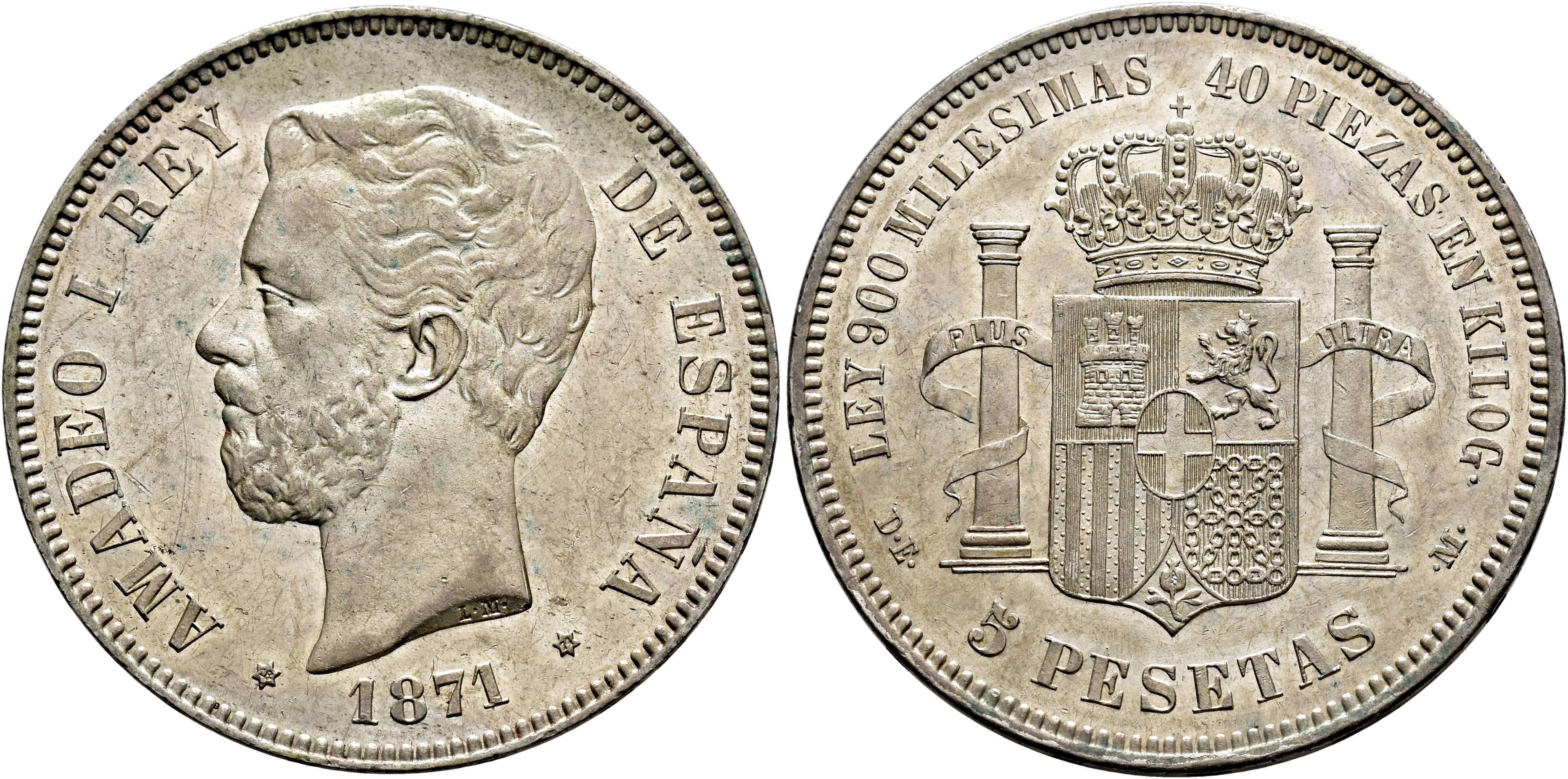 AMADEO I. 5 pesetas. 1871*18-74. Madrid. DEM. AR 25,04 g. 37,3 mm. VII-35; AC-5. EBC/EBC+.