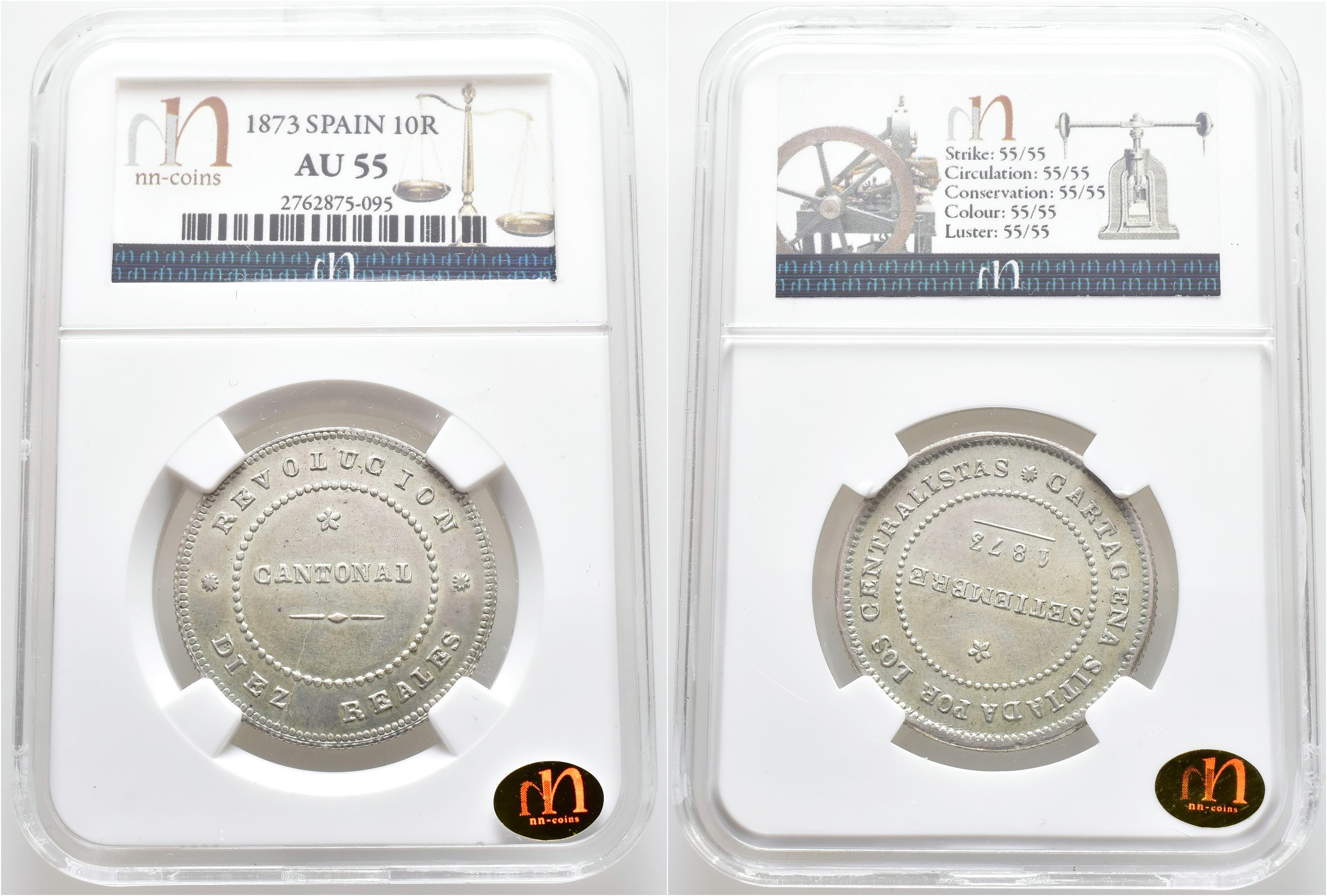 REVOLUCIÓN CANTONAL. 10 reales. 1873. Cartagena. AR. VII-28; AC-4. Encapsulada por NN Coins AU 55.