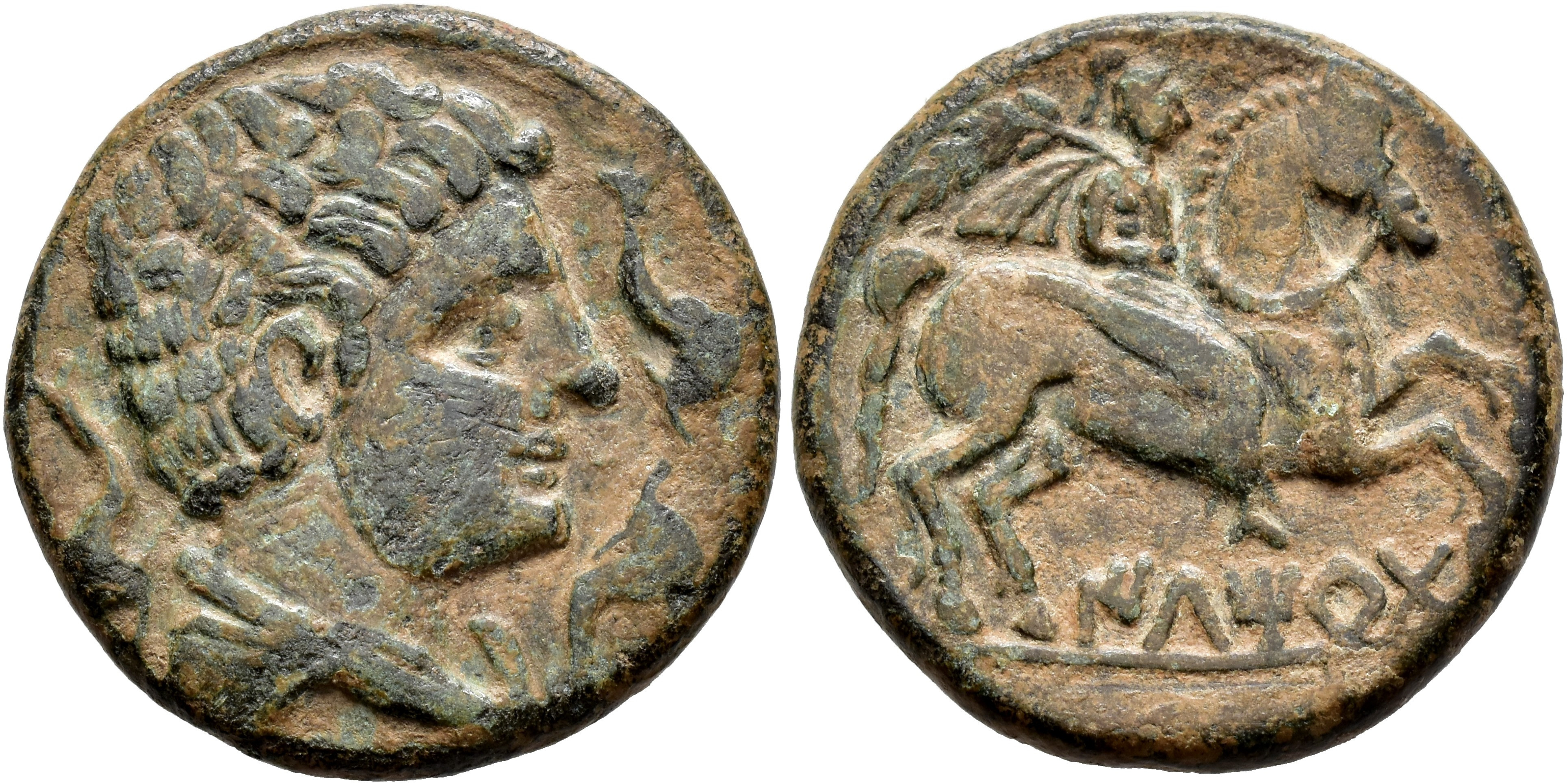 HISPANIA ANTIGUA. ILTIRTA. Unidad. A/ Cabeza masculina a der., alrededor 3 delfines. R/ Jinete con clámide y palma a der., debajo sobre línea ILTiRTa. AE 10,88 g. 26,1 mm. I-1465; ACIP-1251. Raya en anv. Pátina verde terrosa. MBC/MBC+.