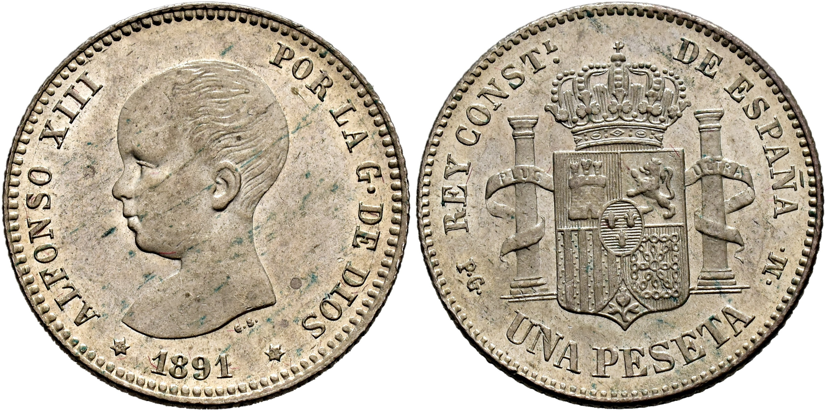 ALFONSO XIII. Peseta. 1891*18-91. Madrid. PGM. AR 5,04 g. 23 mm. VII-151; AC-53. Manchitas. B.O. EBC.