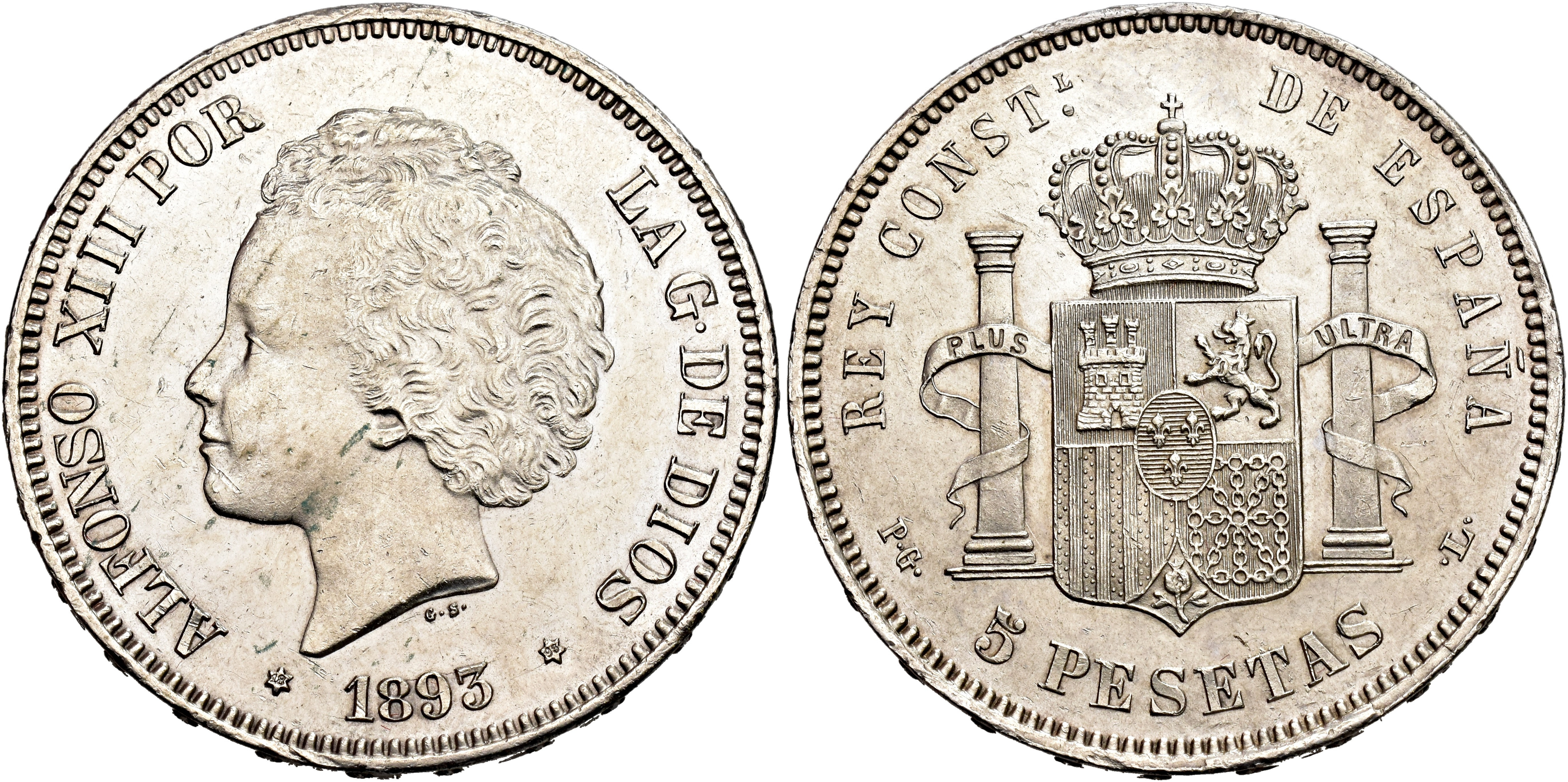 ALFONSO XIII. 5 pesetas. 1893*18-93. Madrid. PGL. AR 24,15 g. 37,4 mm. VII-185; AC-102. B.O. EBC.